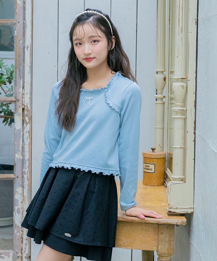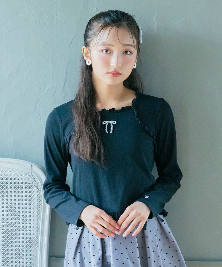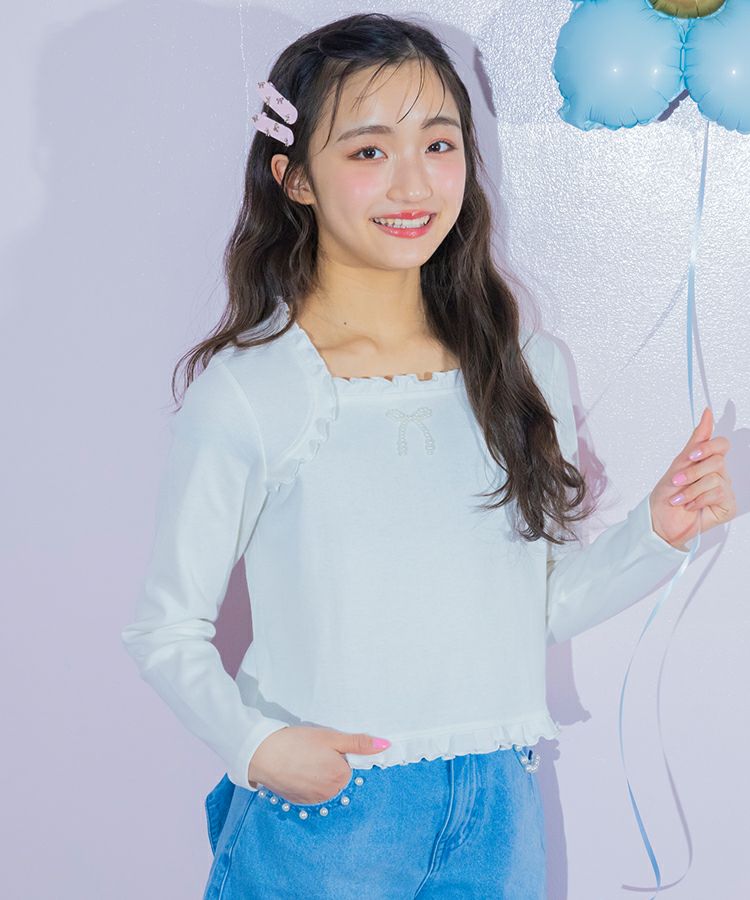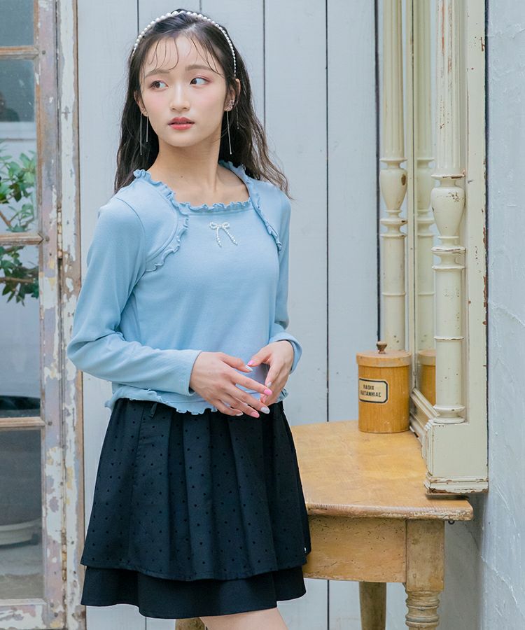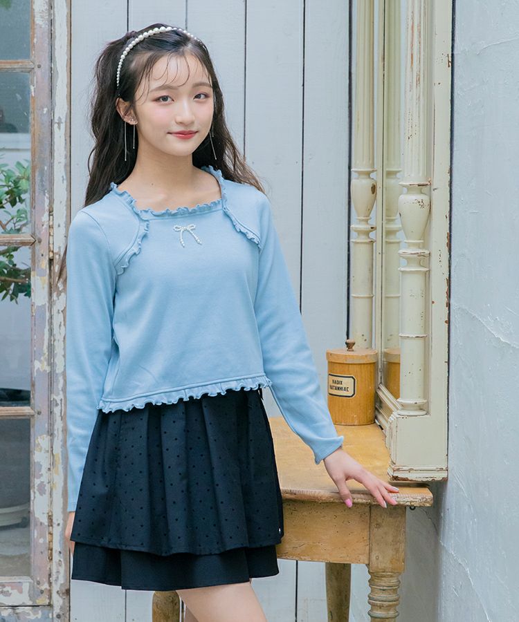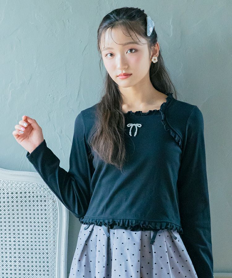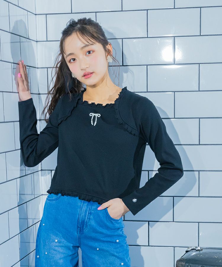 ■デザイン レイヤード風デザインで1枚でもきまるリブロンT。フロントのフリルとパールにときめくトップスです。