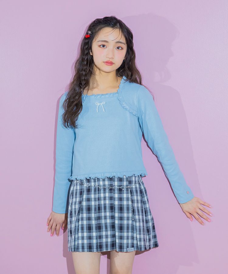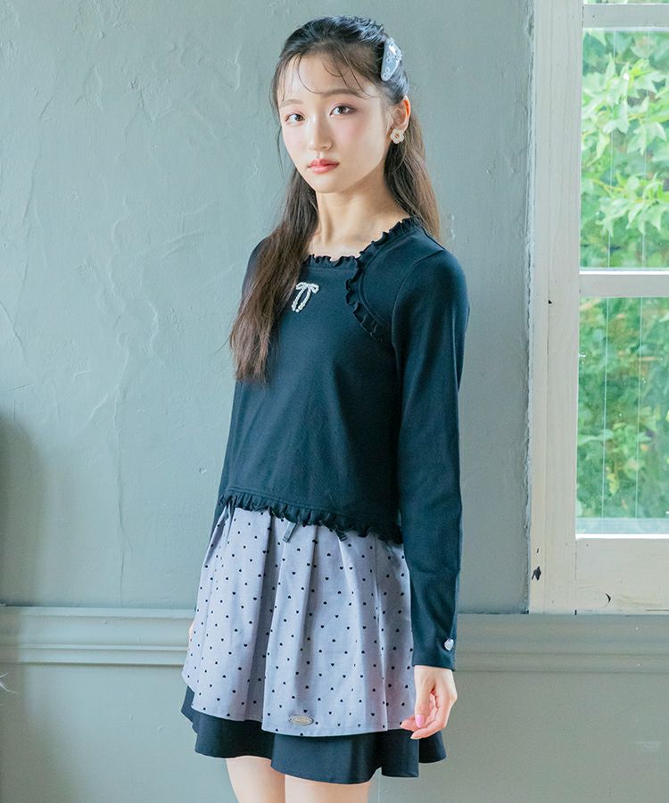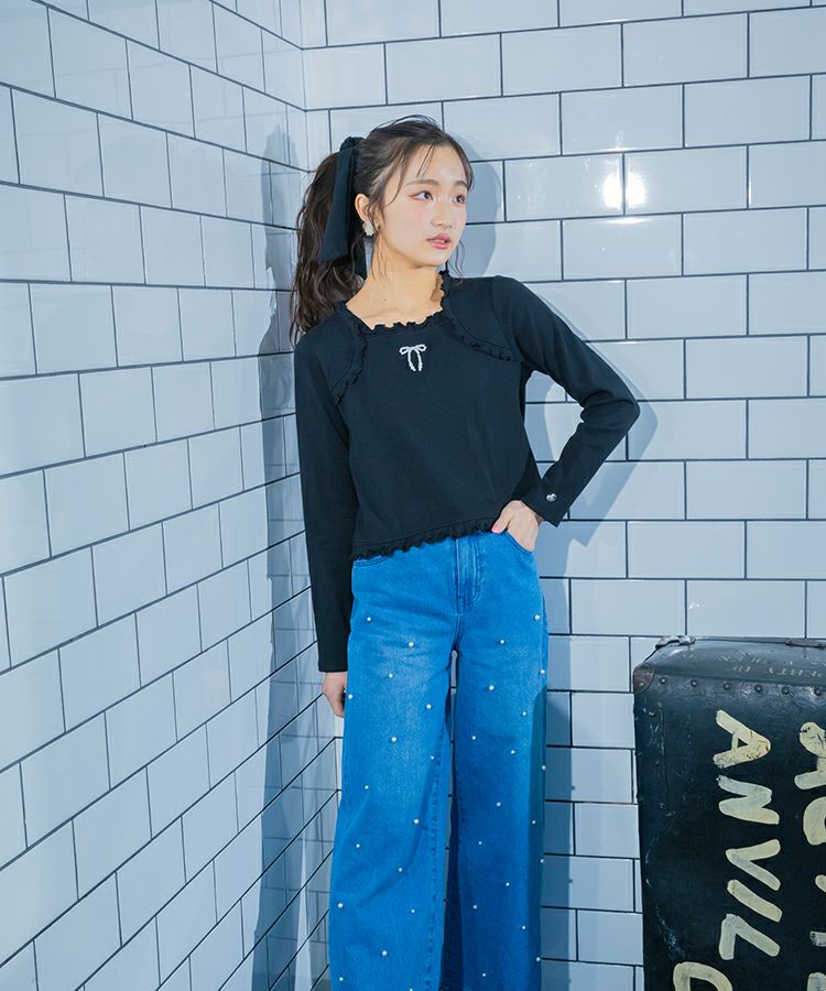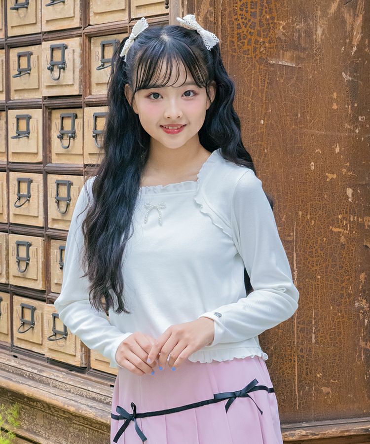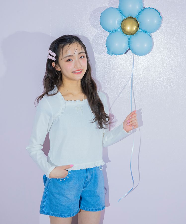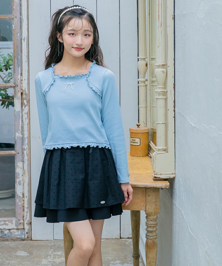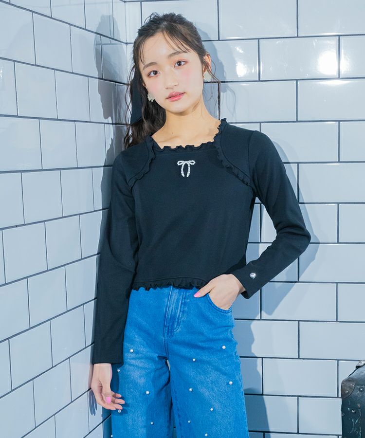 ■デザイン レイヤード風デザインで1枚でもきまるリブロンT。フロントのフリルとパールにときめくトップスです。