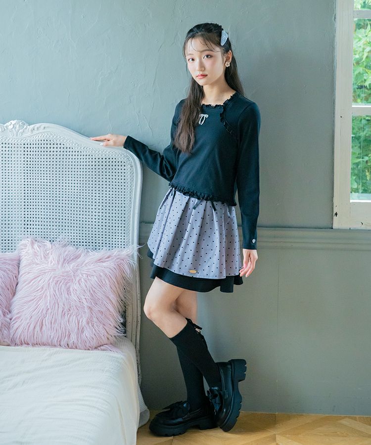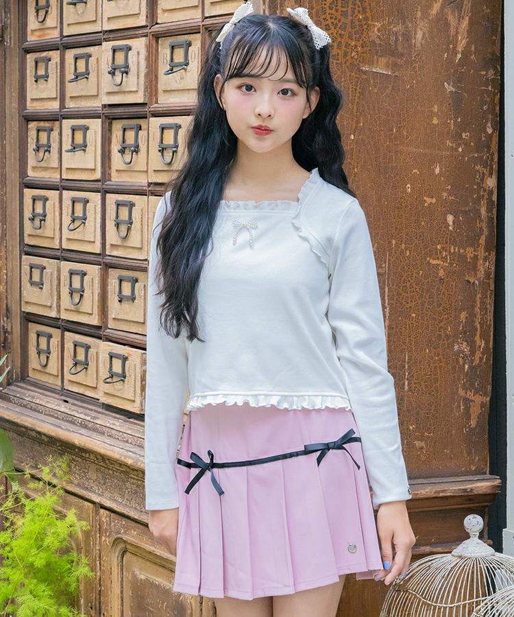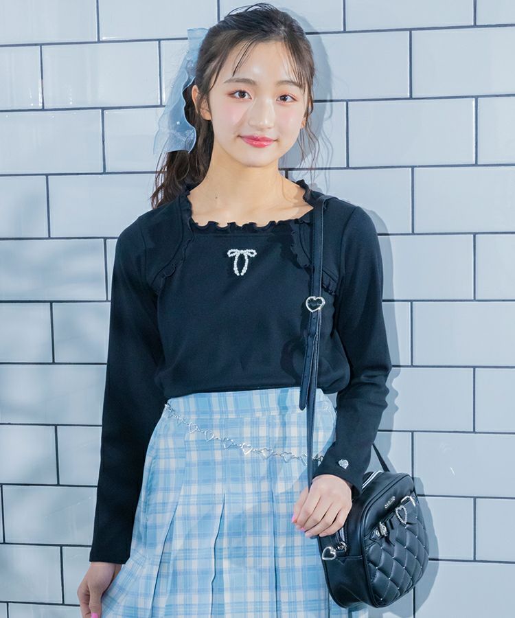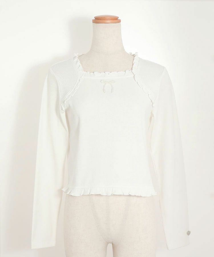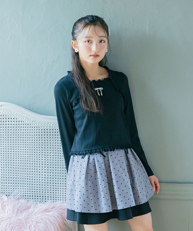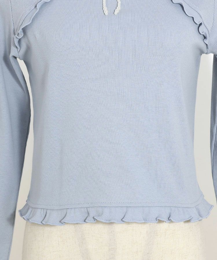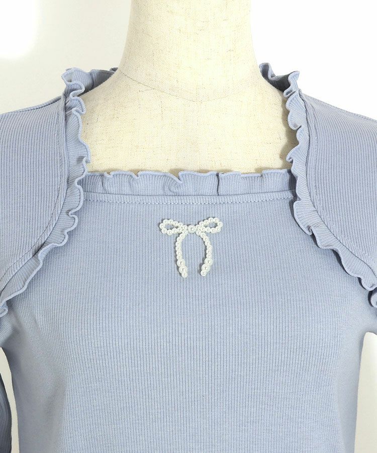 ■デザイン レイヤード風デザインで1枚でもきまるリブロンT。フロントのフリルとパールにときめくトップスです。