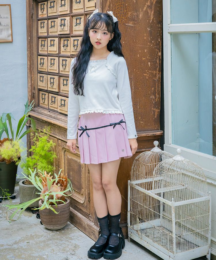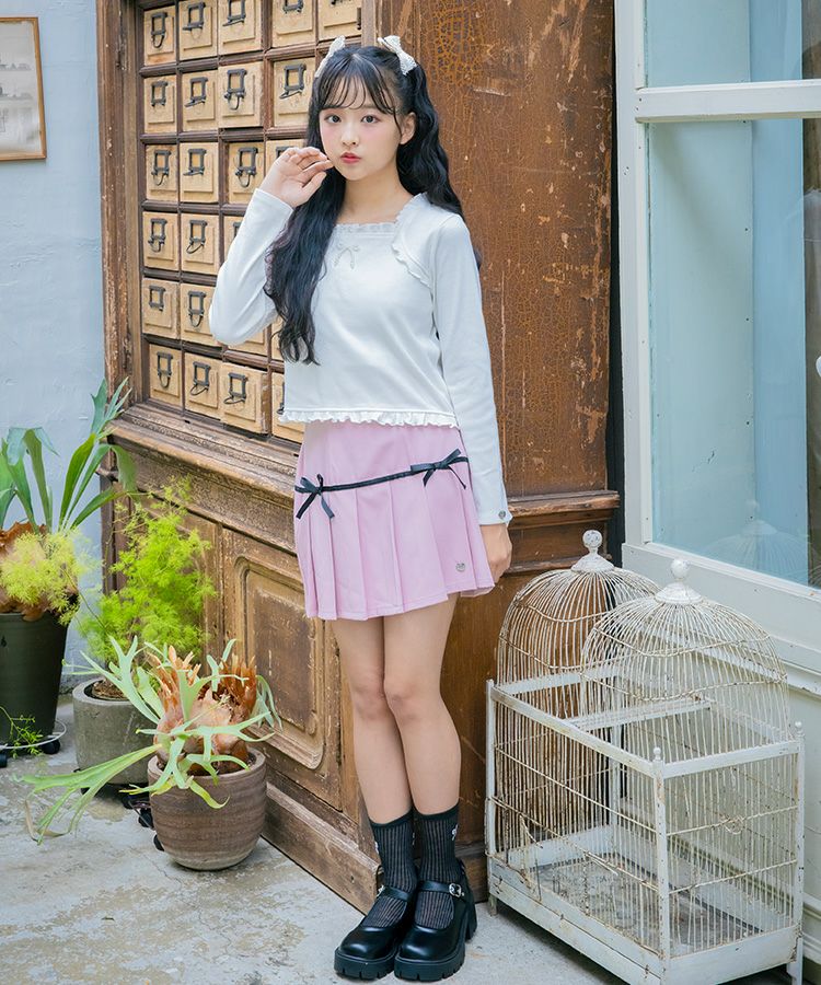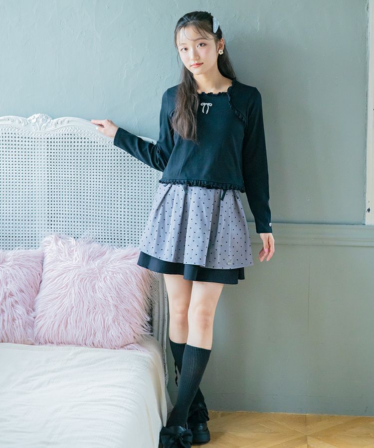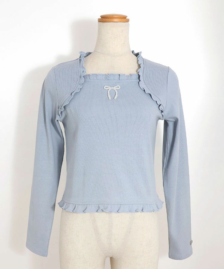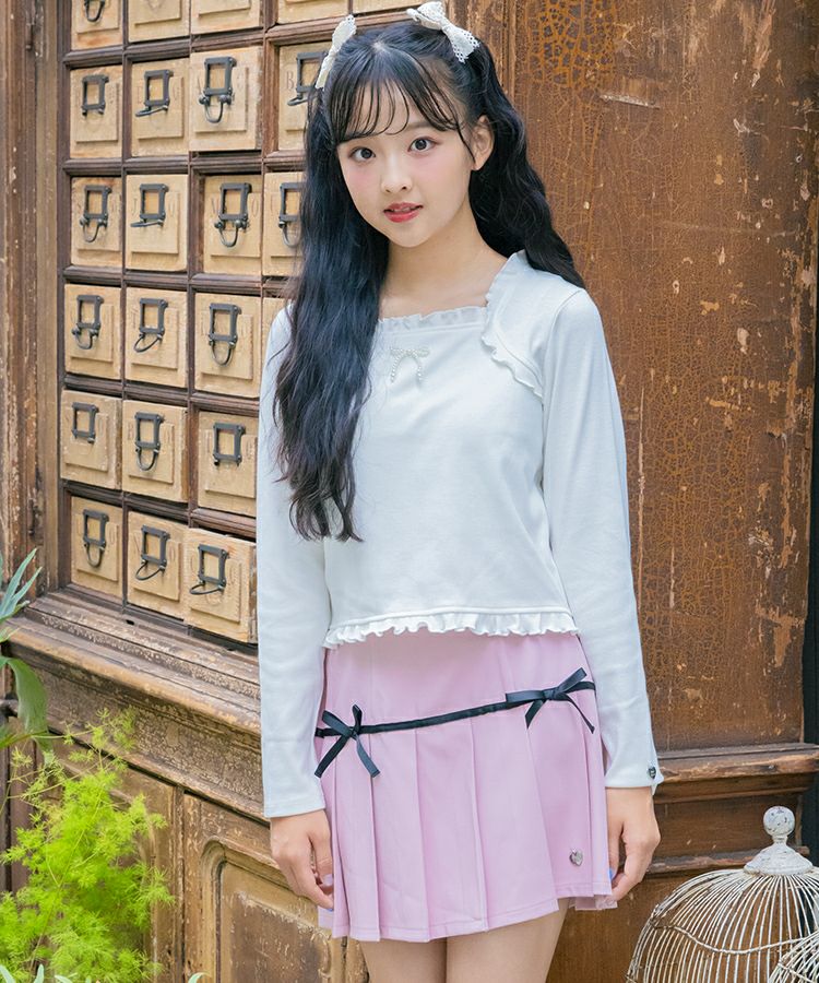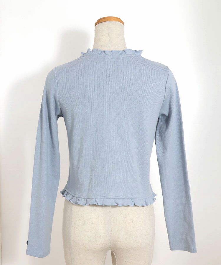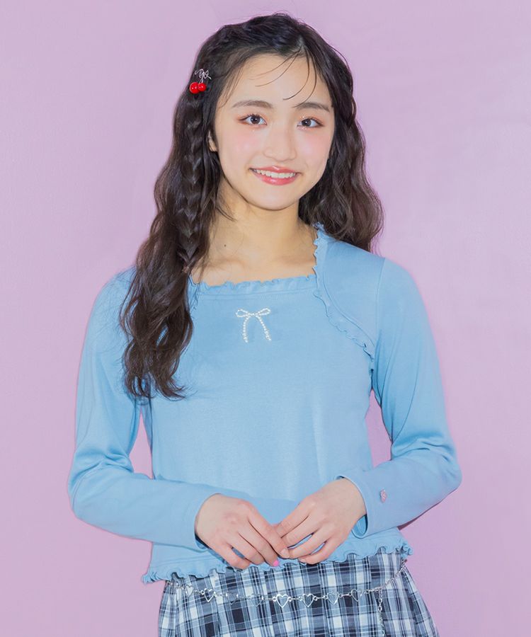 ■デザイン レイヤード風デザインで1枚でもきまるリブロンT。フロントのフリルとパールにときめくトップスです。