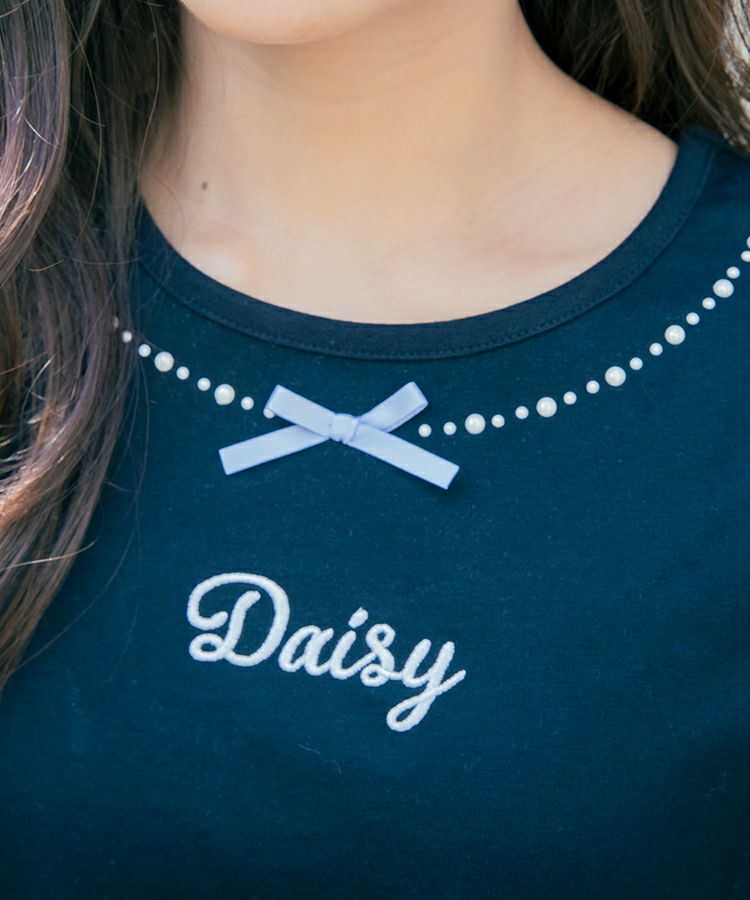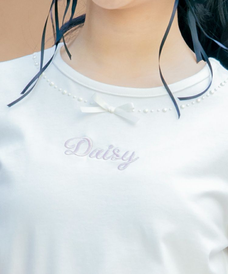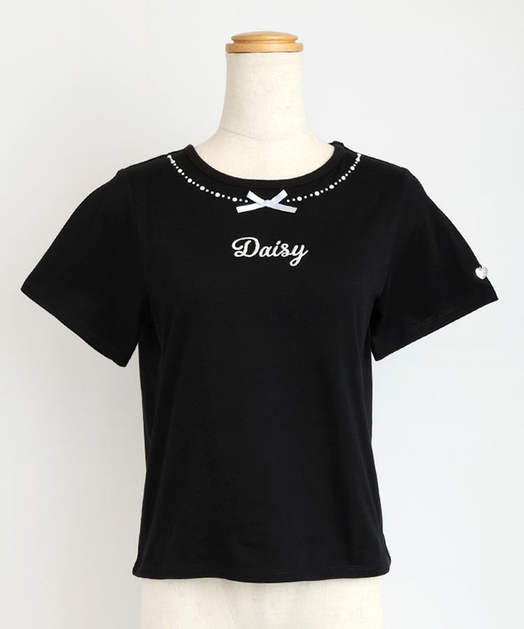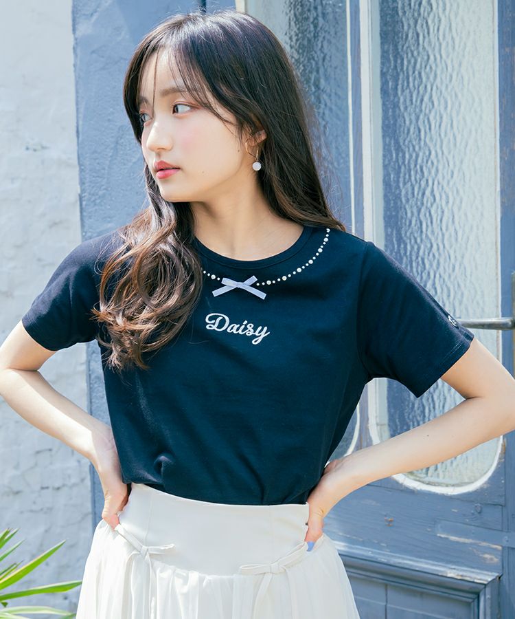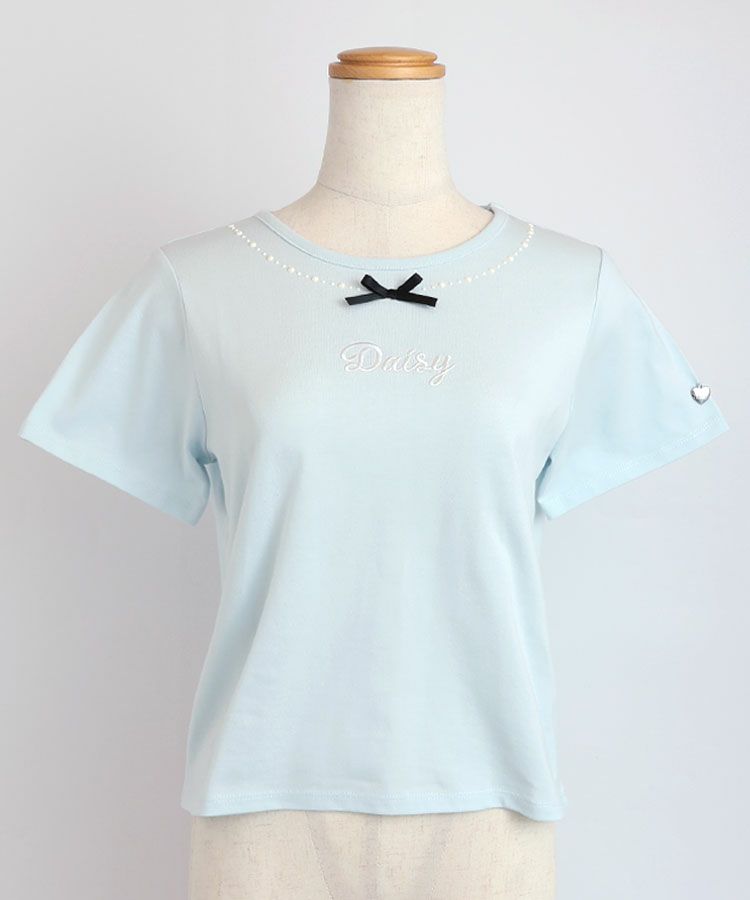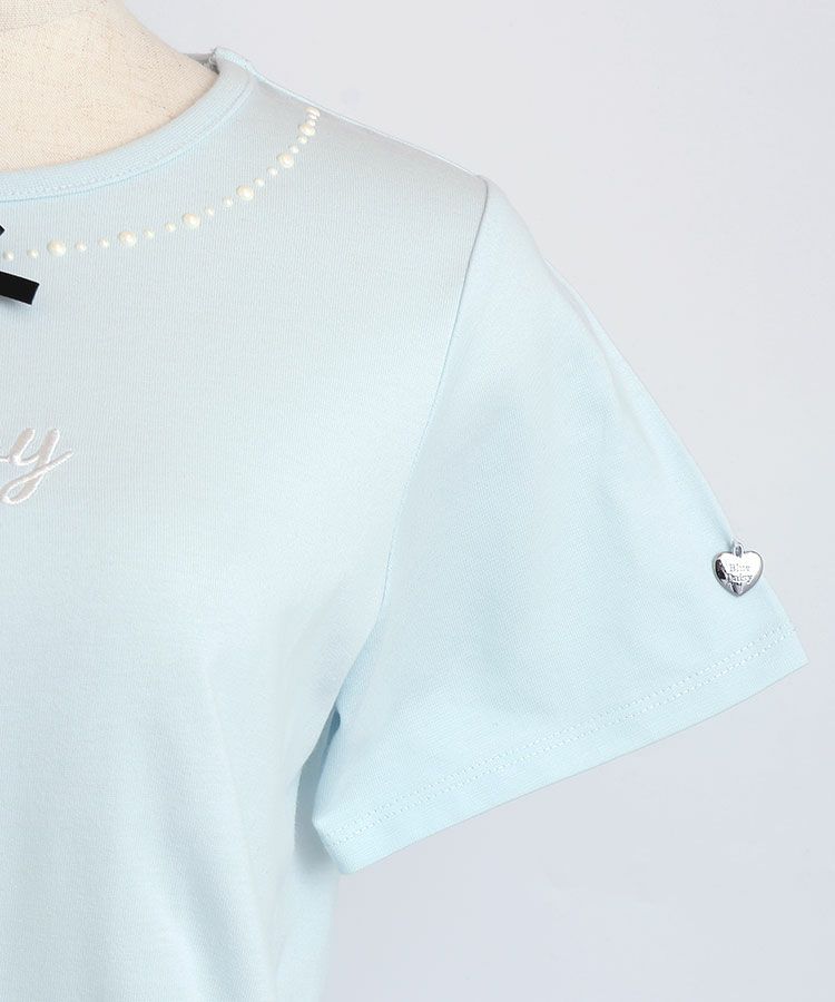 ■デザイン ただのカジュアルにはなりたくないみんなにおすすめのガーリーTシャツです。大小のパールデザインとリボン、そでについてるハートチャームなど各パーツがどれも甘い印象に。胸元のデイジー刺繍が大人っぽく仕上がっています。