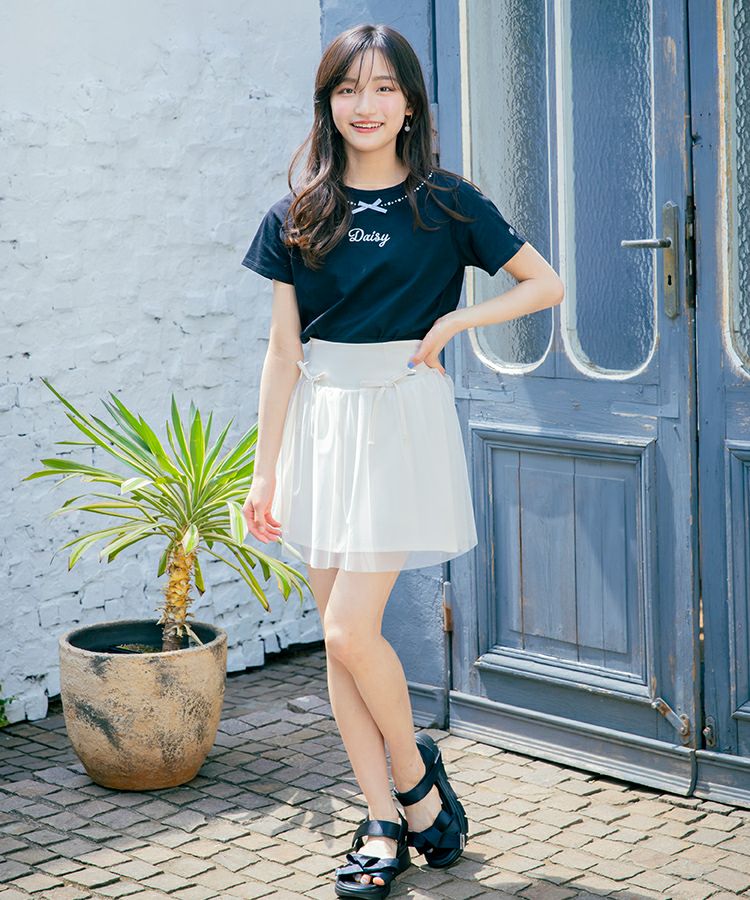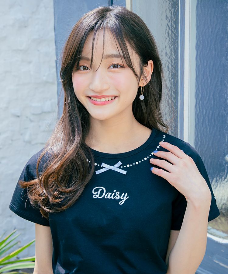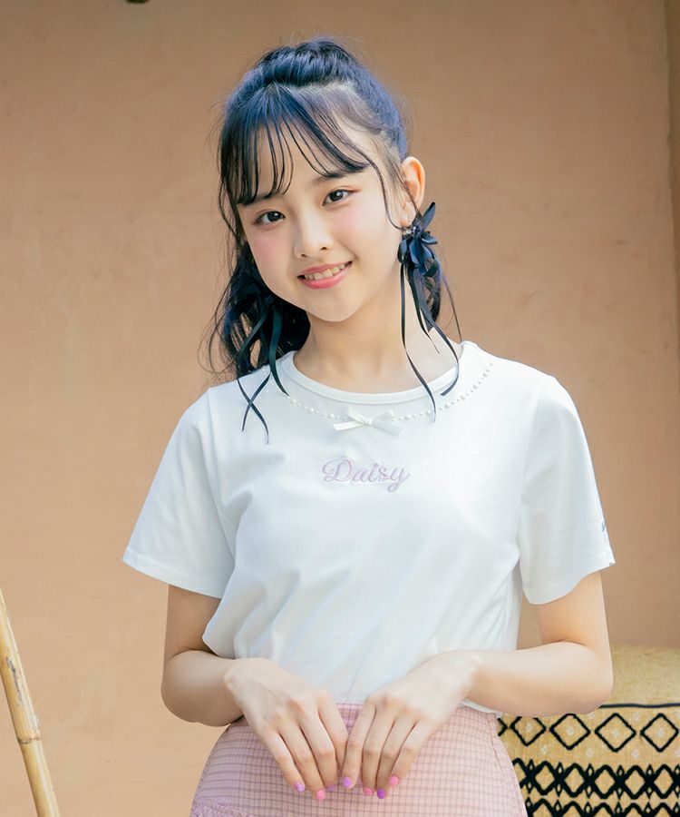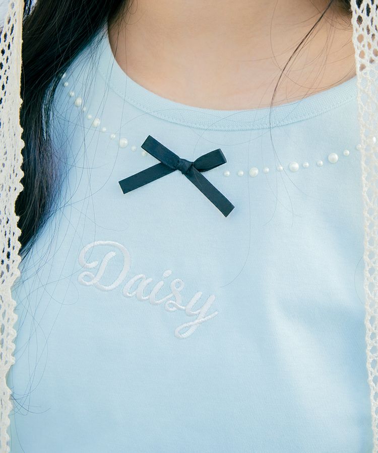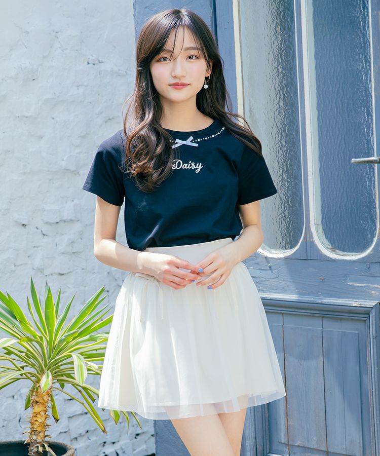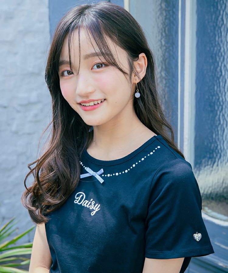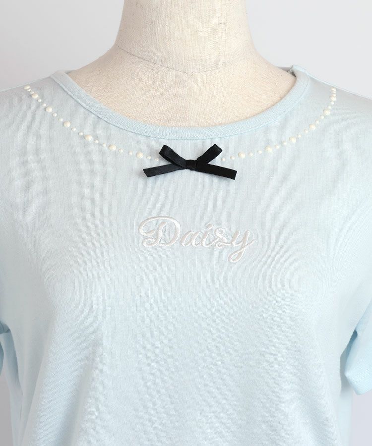 ■デザイン ただのカジュアルにはなりたくないみんなにおすすめのガーリーTシャツです。大小のパールデザインとリボン、そでについてるハートチャームなど各パーツがどれも甘い印象に。胸元のデイジー刺繍が大人っぽく仕上がっています。