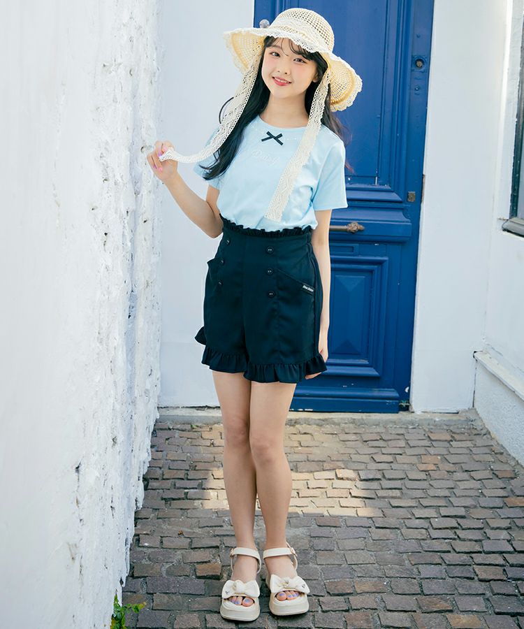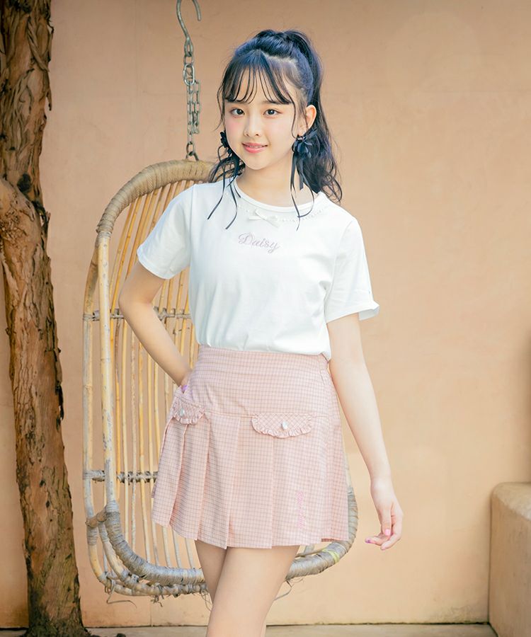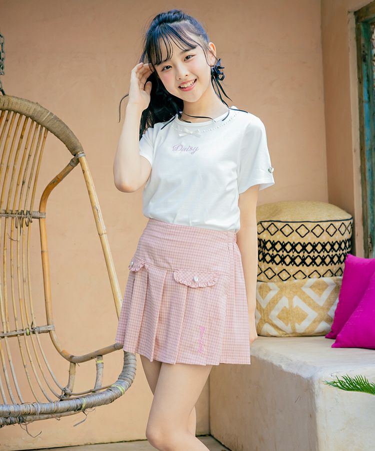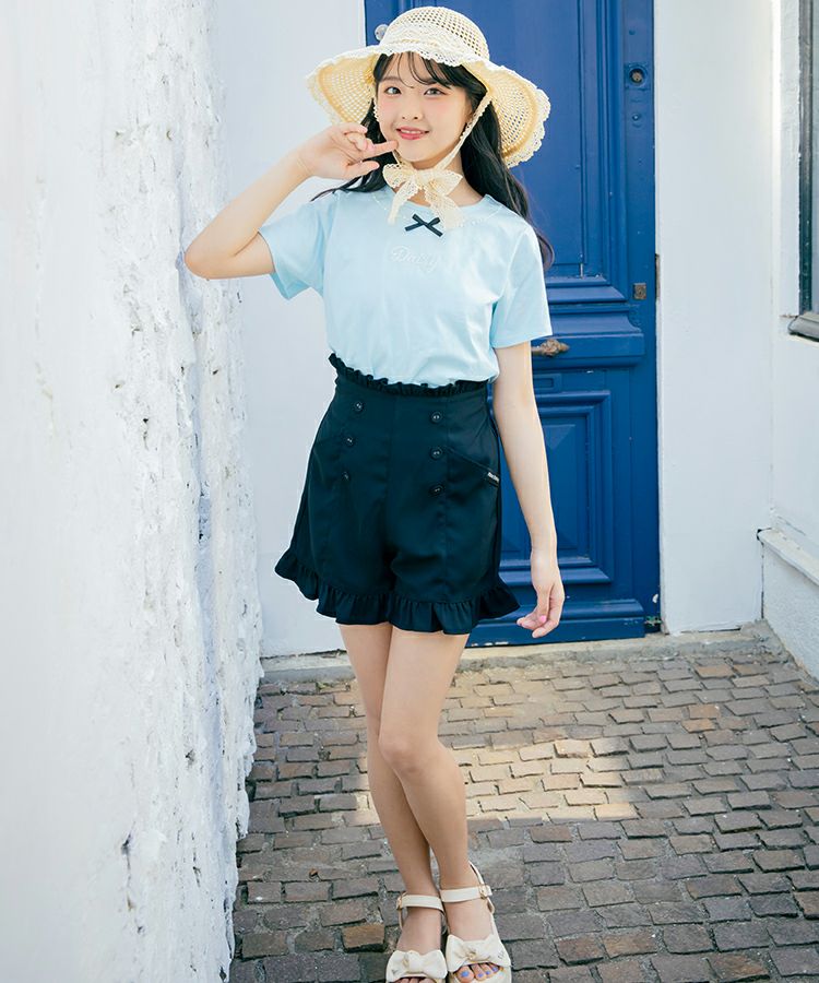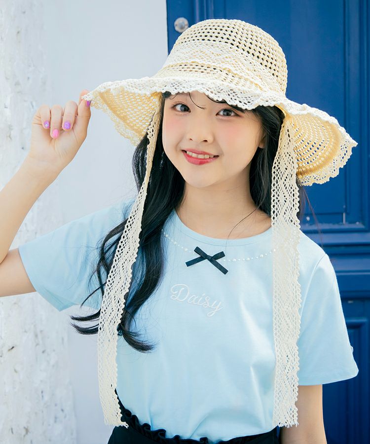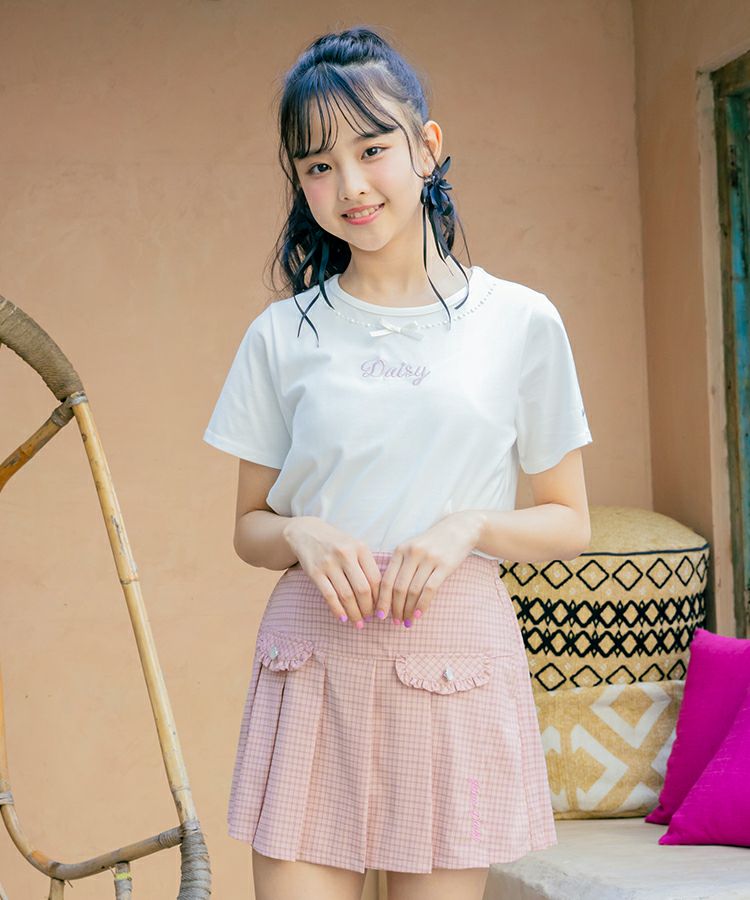 ■デザイン ただのカジュアルにはなりたくないみんなにおすすめのガーリーTシャツです。大小のパールデザインとリボン、そでについてるハートチャームなど各パーツがどれも甘い印象に。胸元のデイジー刺繍が大人っぽく仕上がっています。