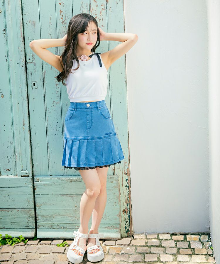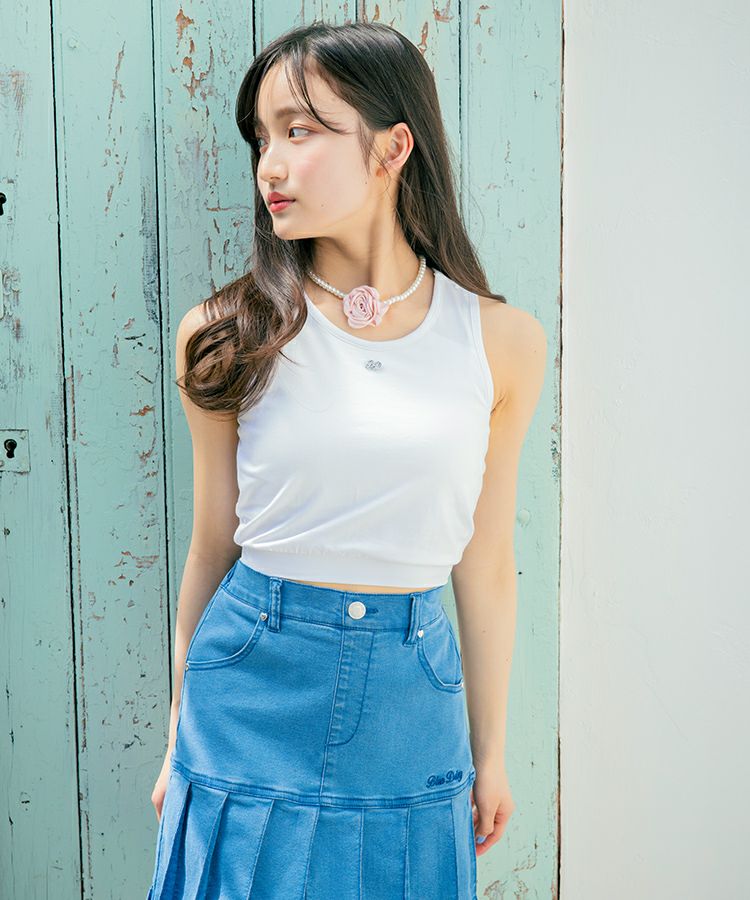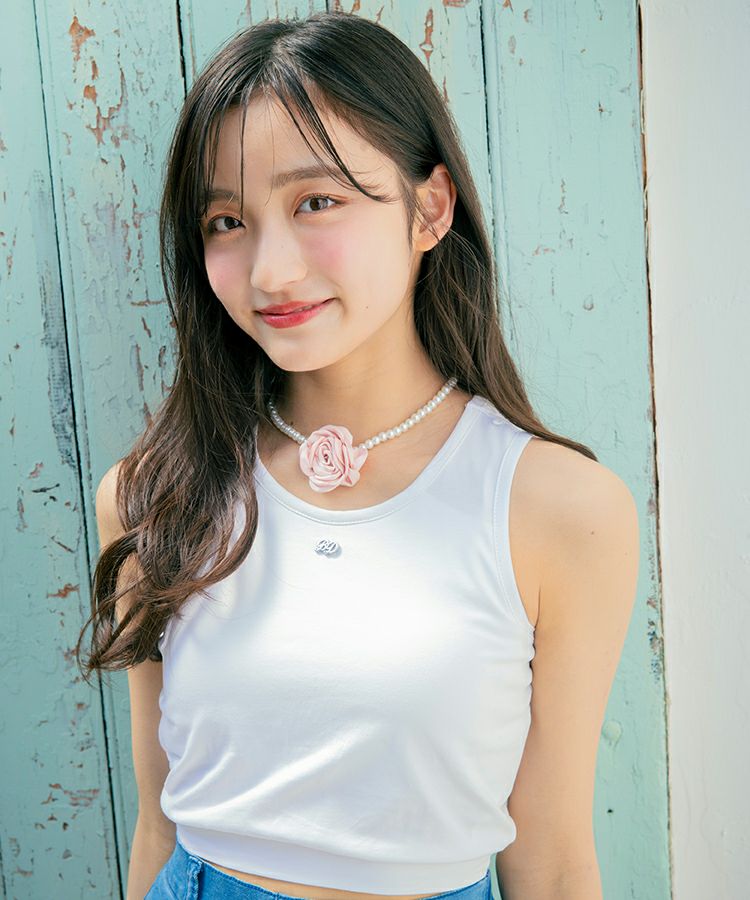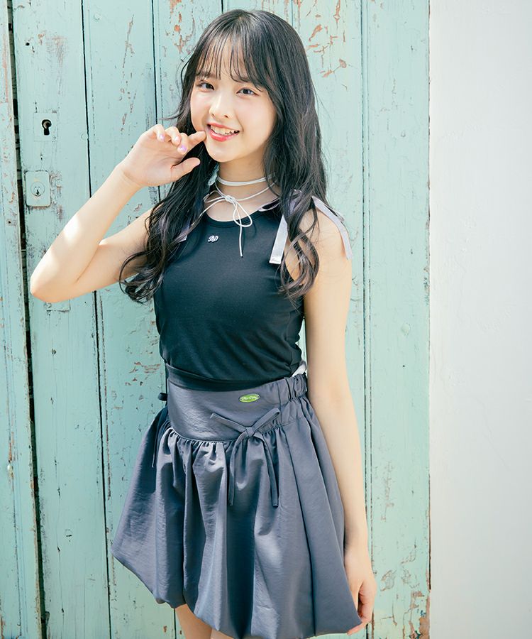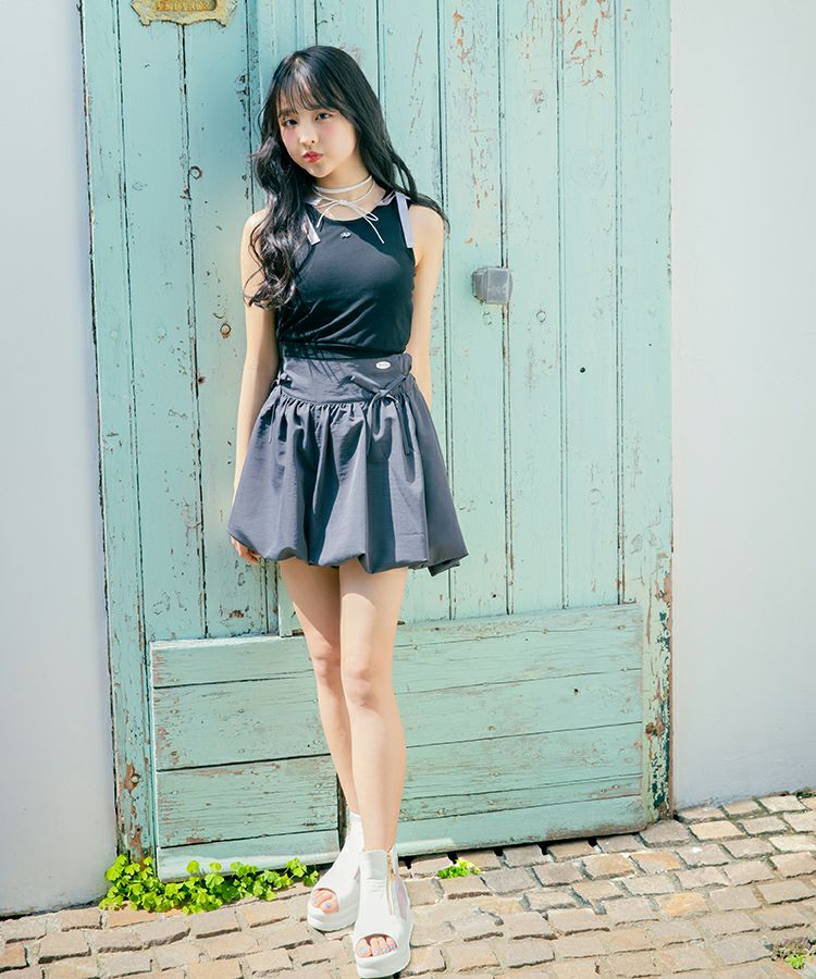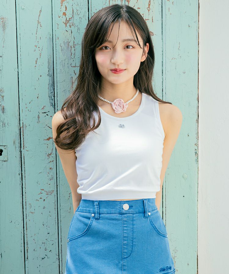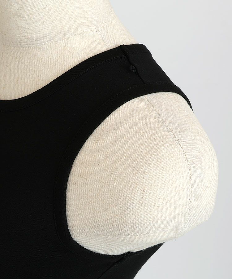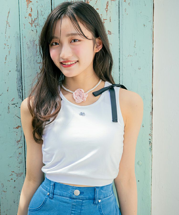 ■デザイン ボタンで取り外しができるリボンがついたショート丈のタンクです。インナーとして着用する時はリボンを取ることができます。全サイズパットが入っていて必要に応じて取り外すことも可能です。