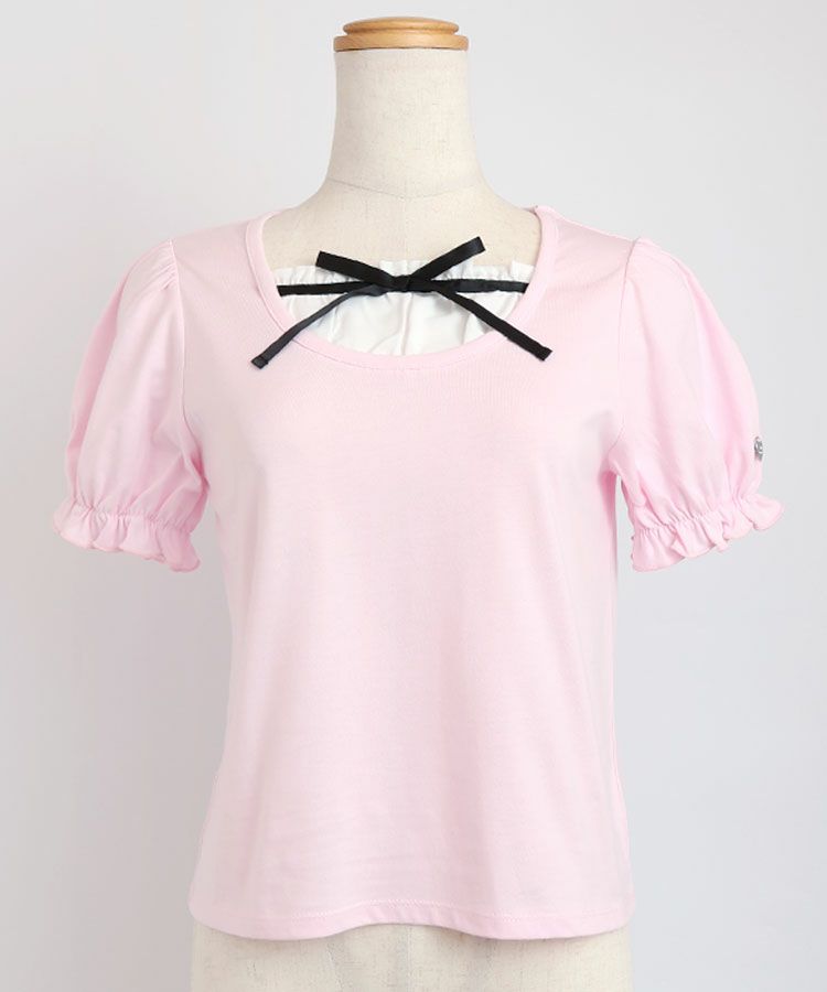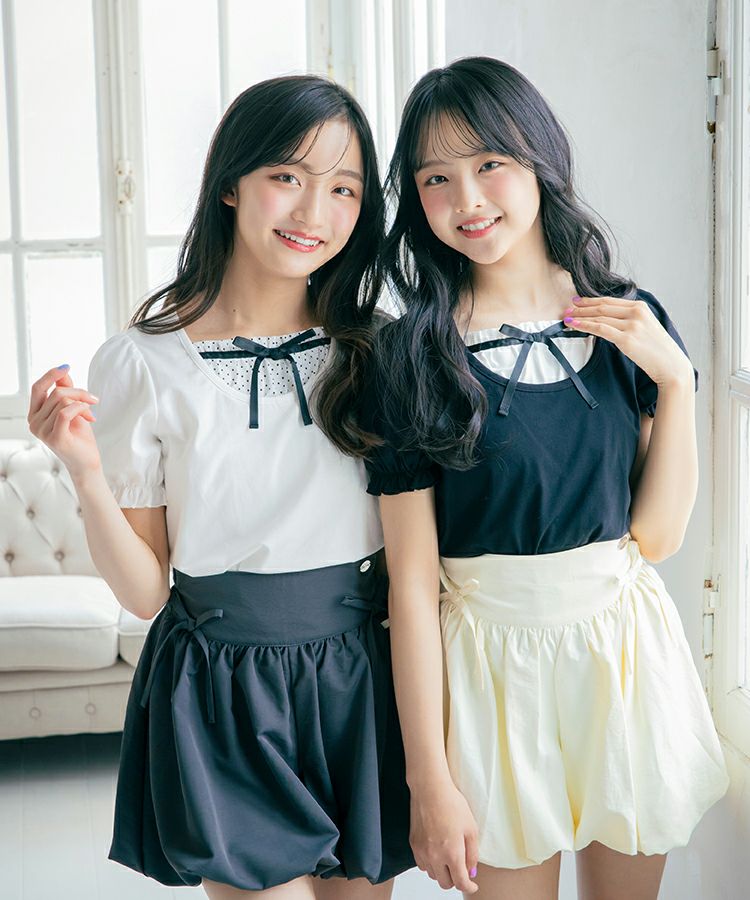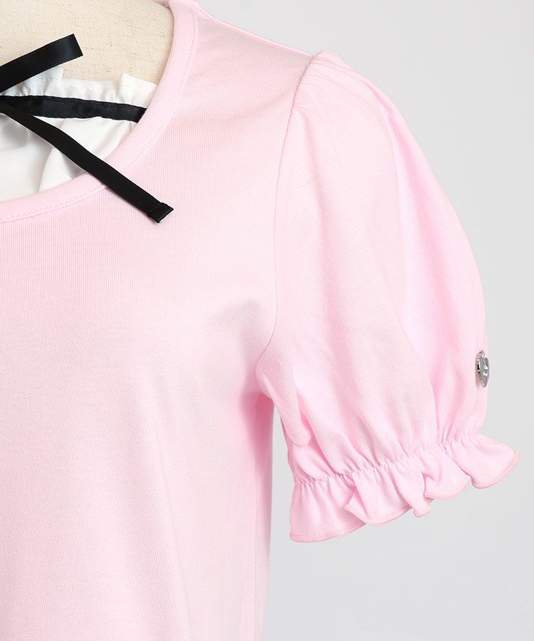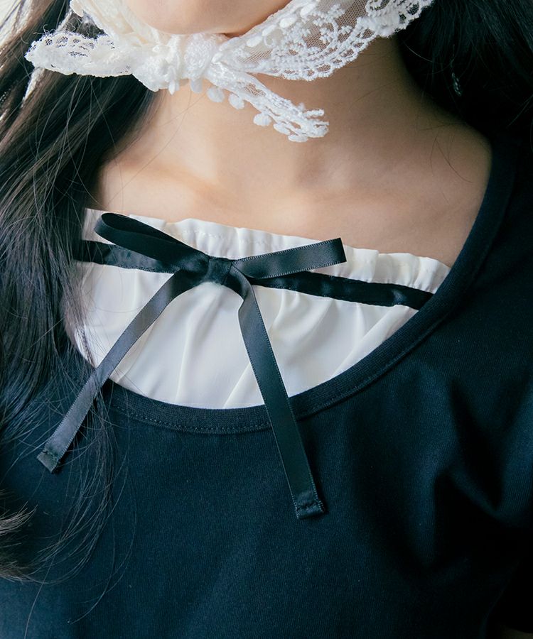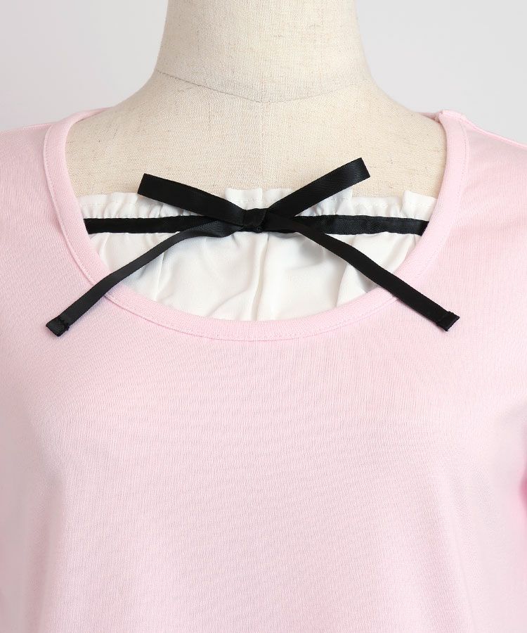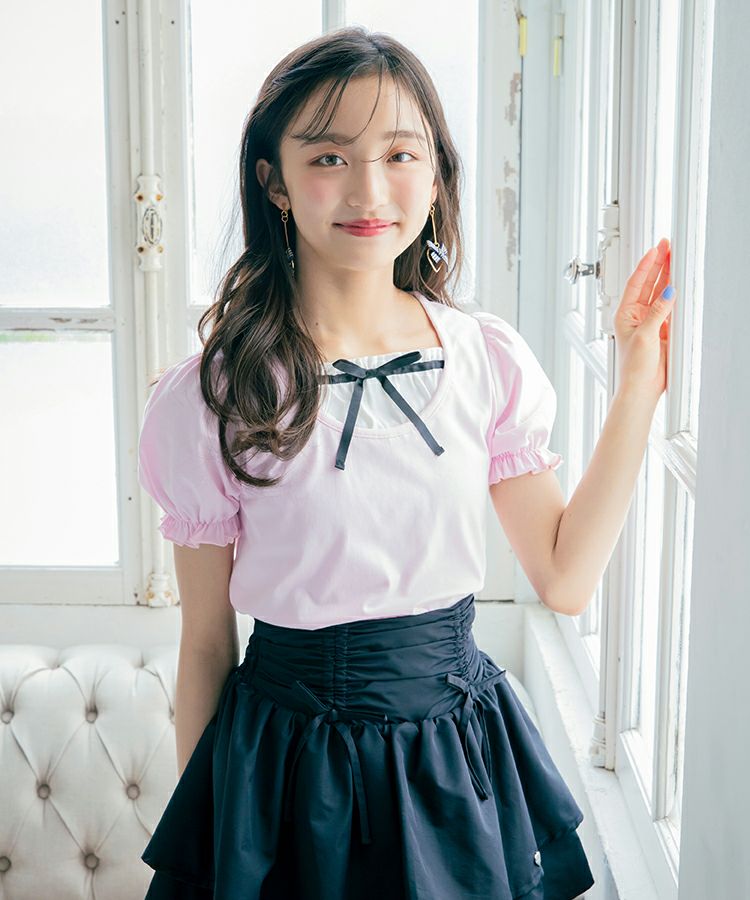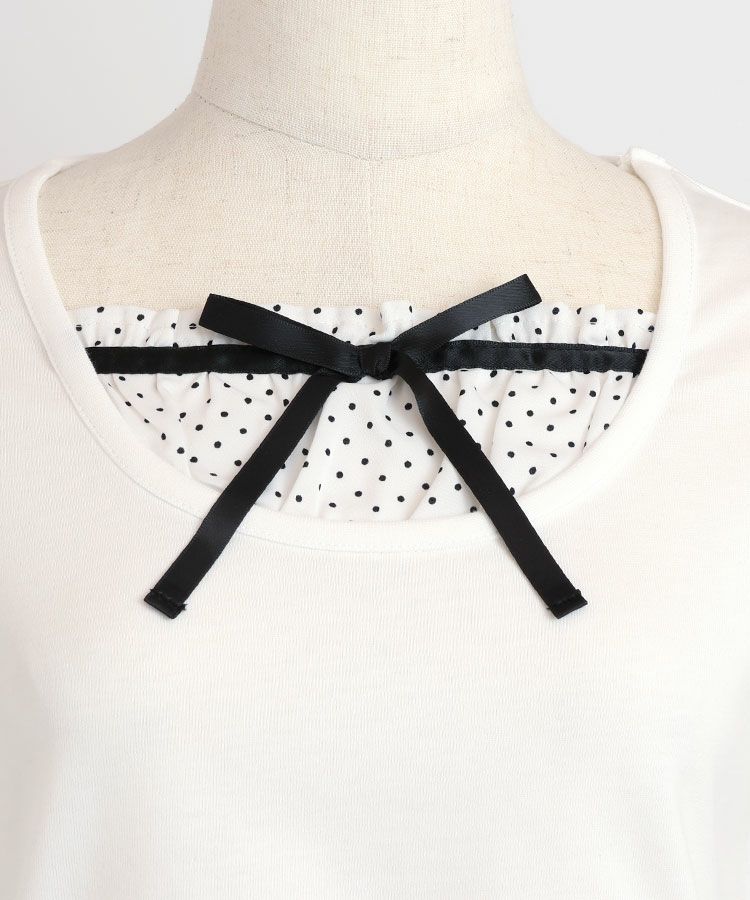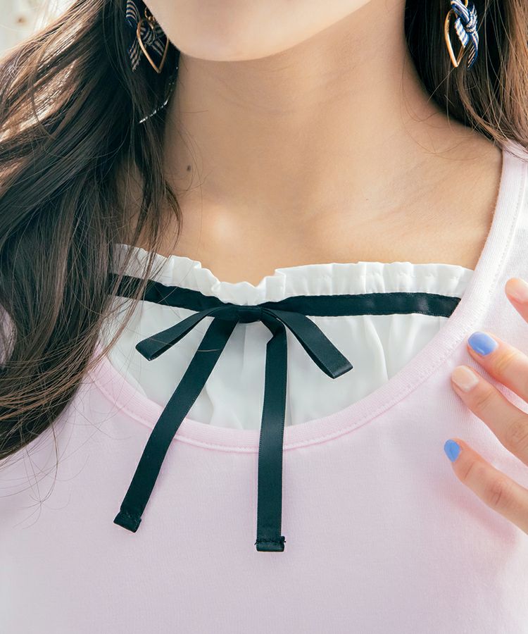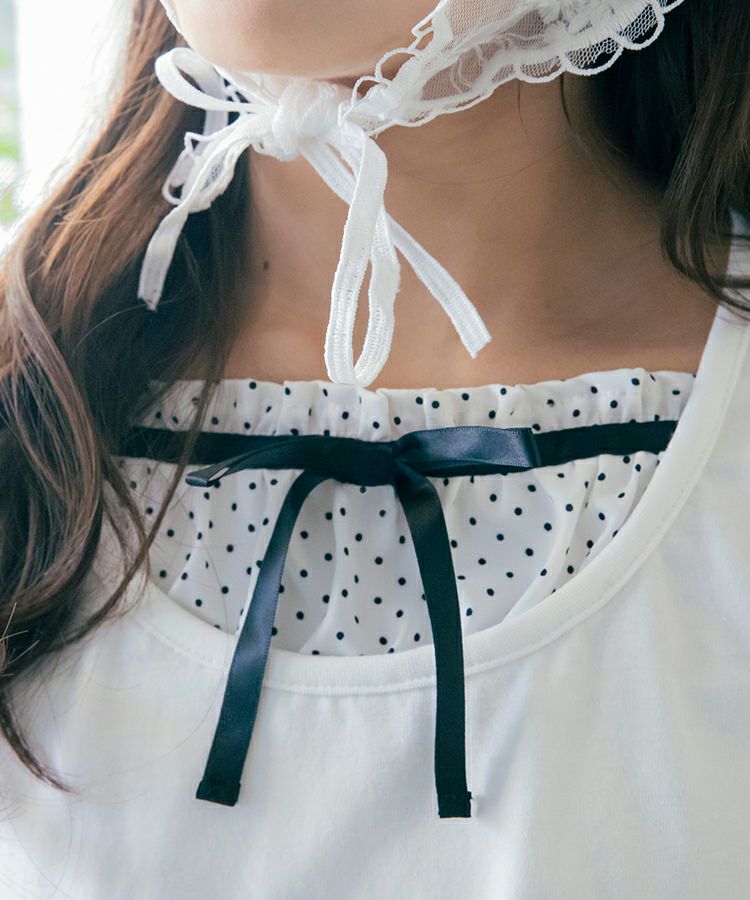 ■デザイン 黒とピンクのインナーは無地、白のインナーはドットを合わせているのでレイヤード感がしっかりわかります。ガーリー度満点のTシャツは1枚でも華やかな印象に。
