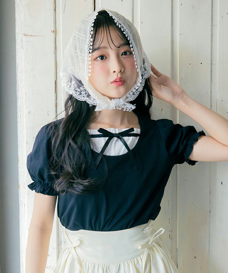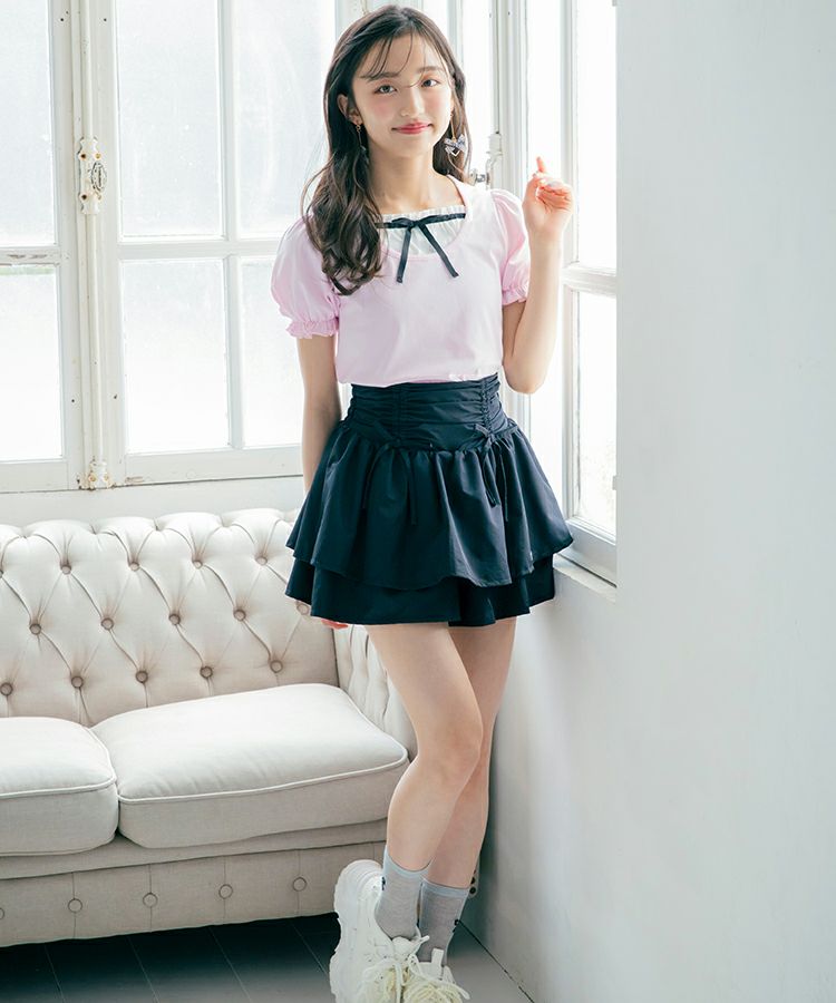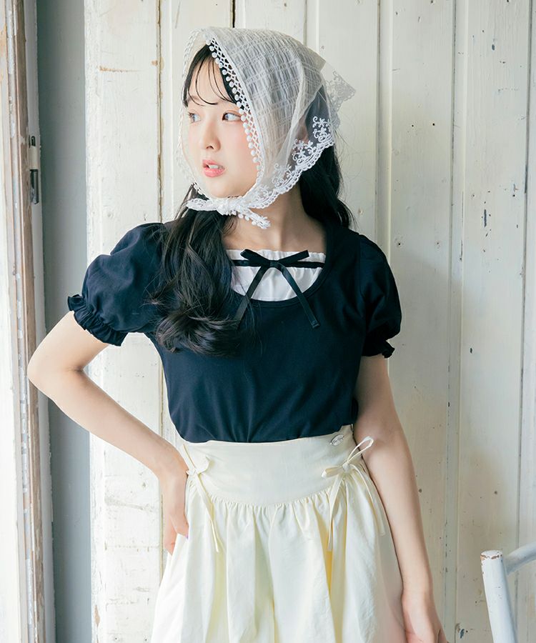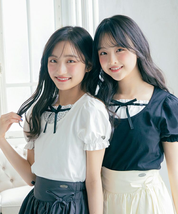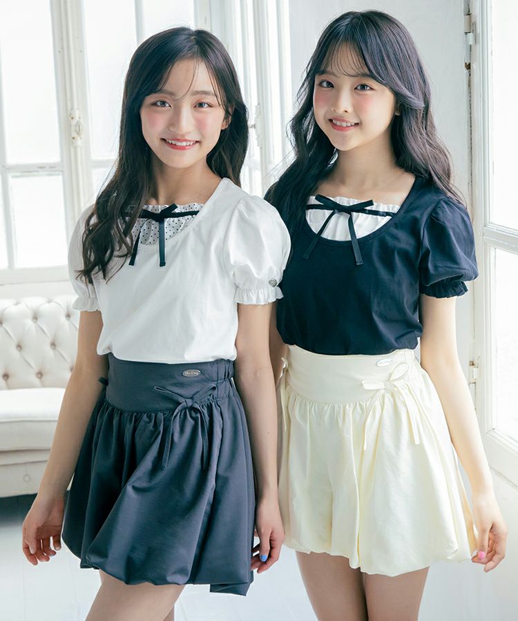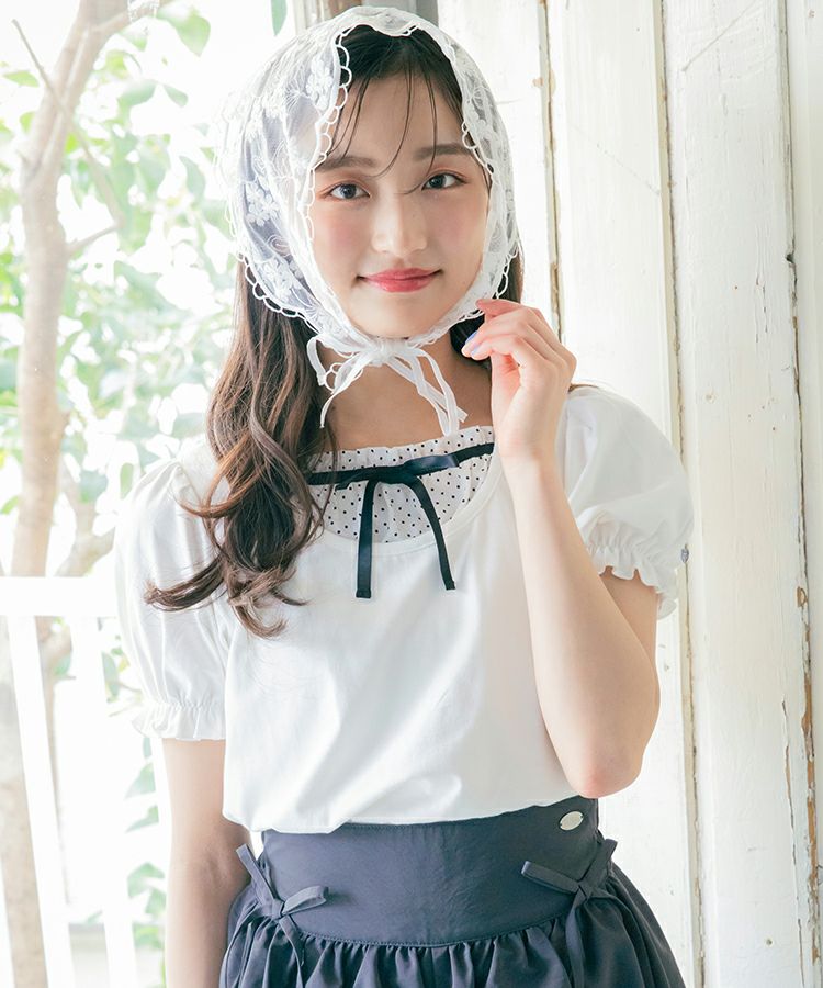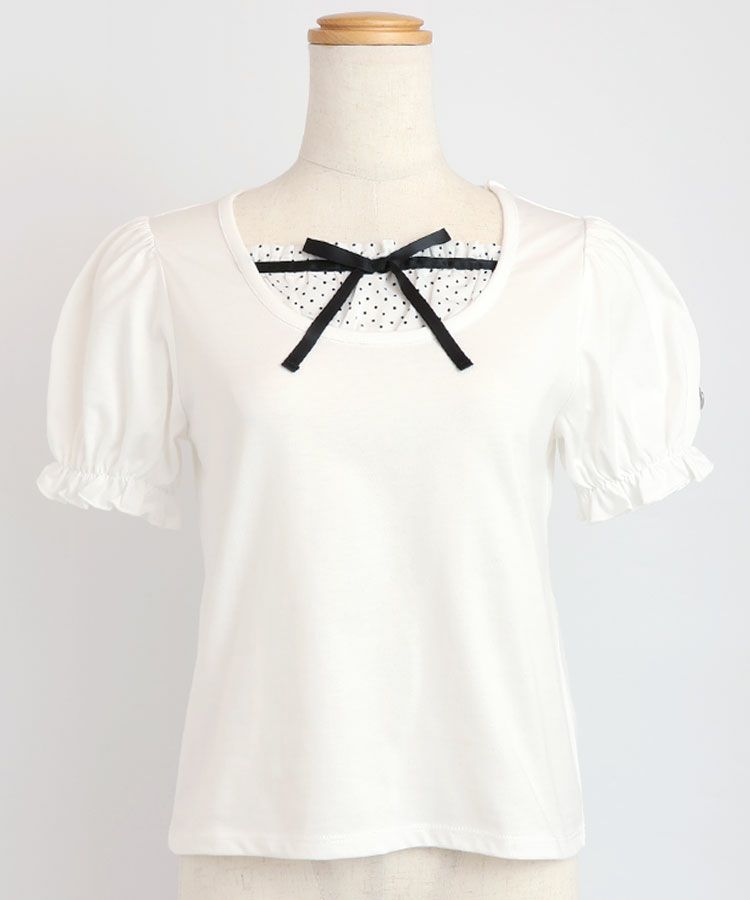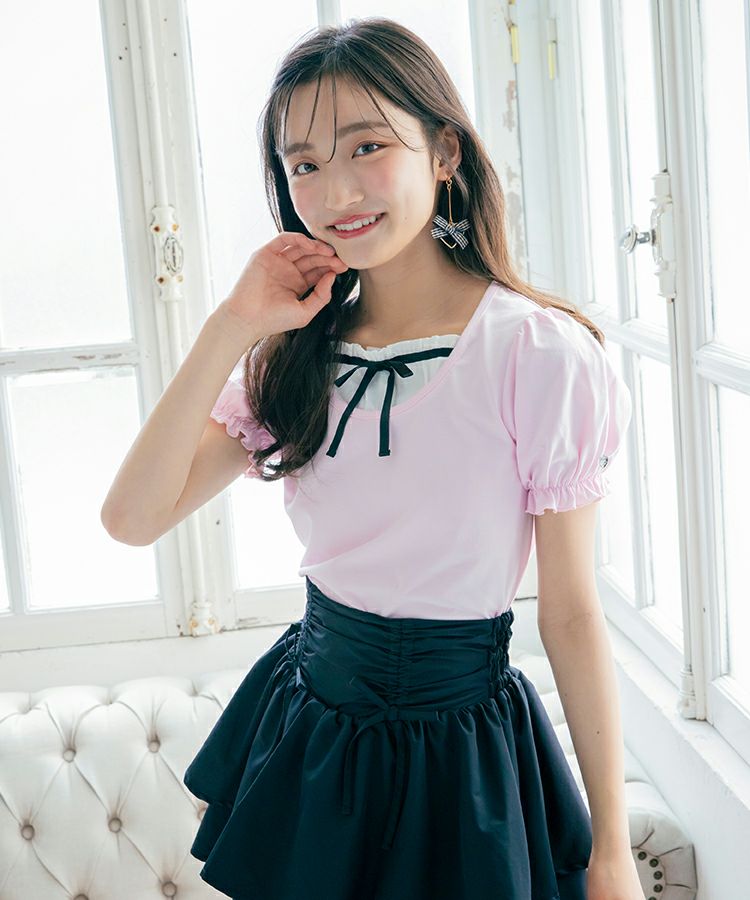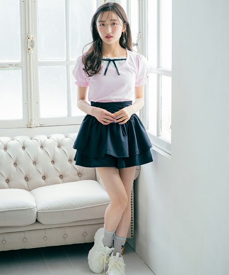 ■デザイン 黒とピンクのインナーは無地、白のインナーはドットを合わせているのでレイヤード感がしっかりわかります。ガーリー度満点のTシャツは1枚でも華やかな印象に。