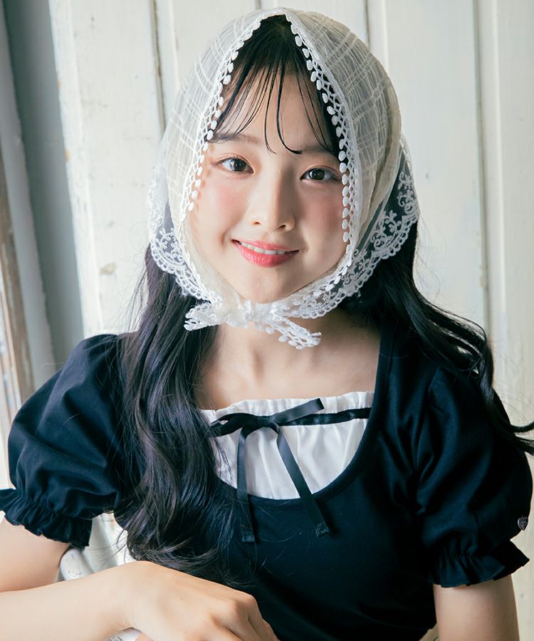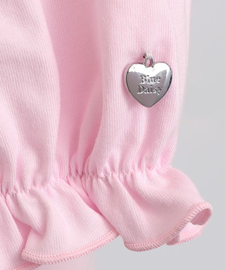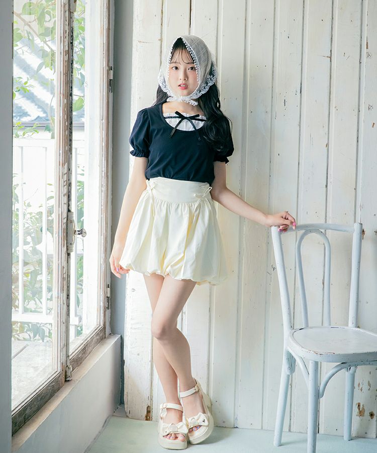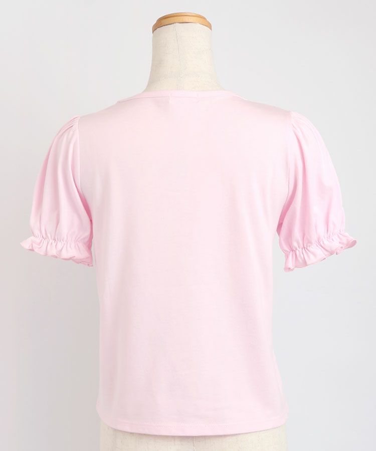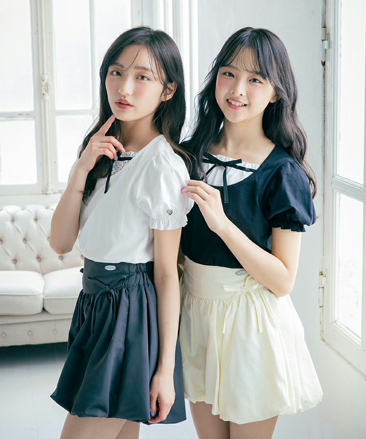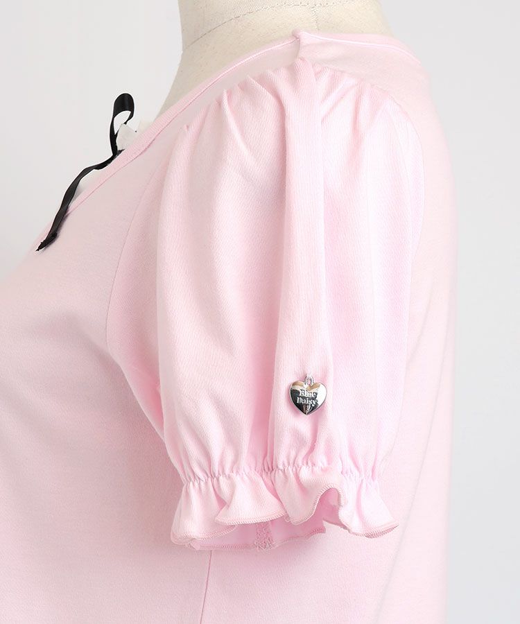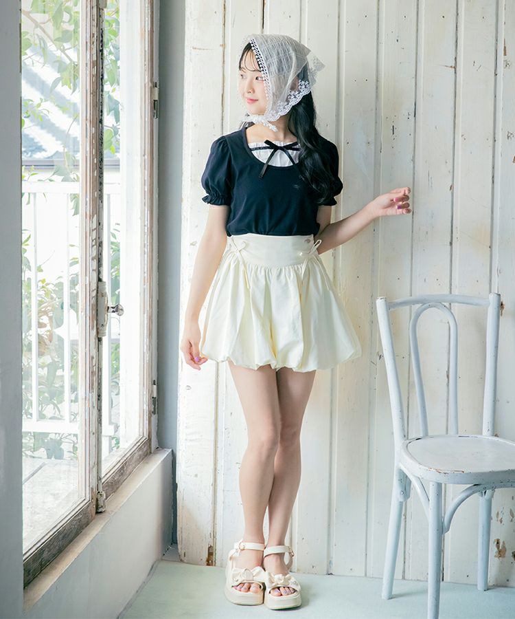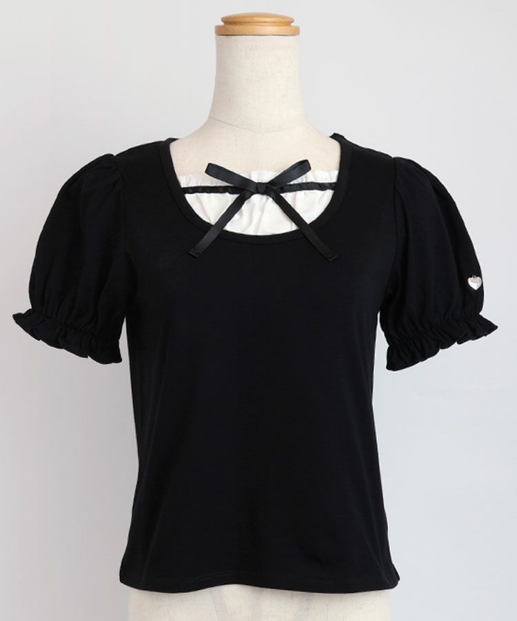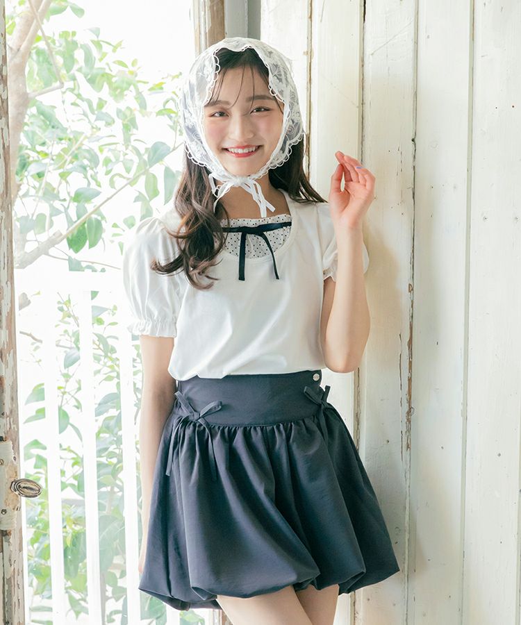 ■デザイン 黒とピンクのインナーは無地、白のインナーはドットを合わせているのでレイヤード感がしっかりわかります。ガーリー度満点のTシャツは1枚でも華やかな印象に。