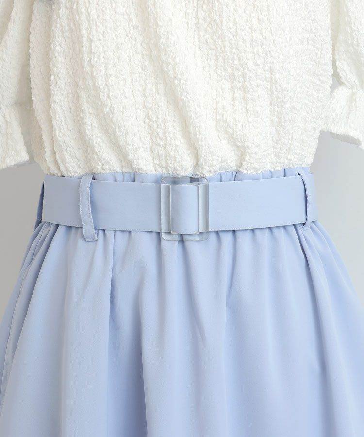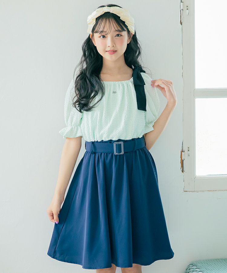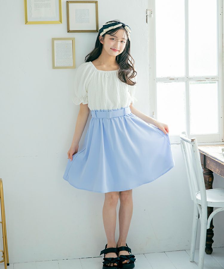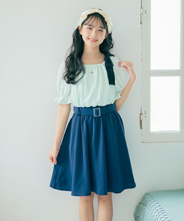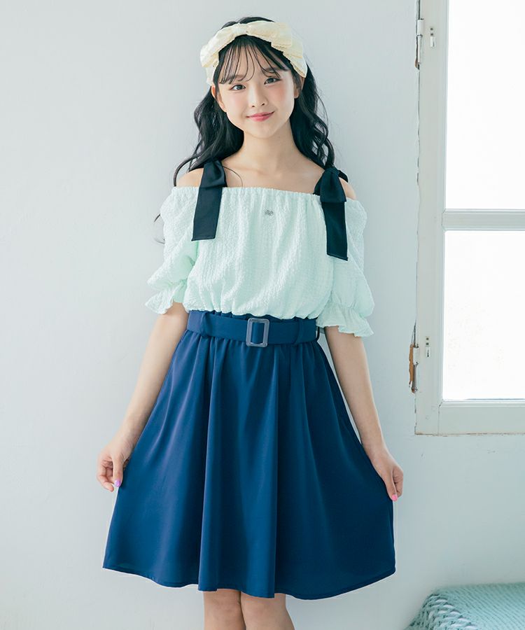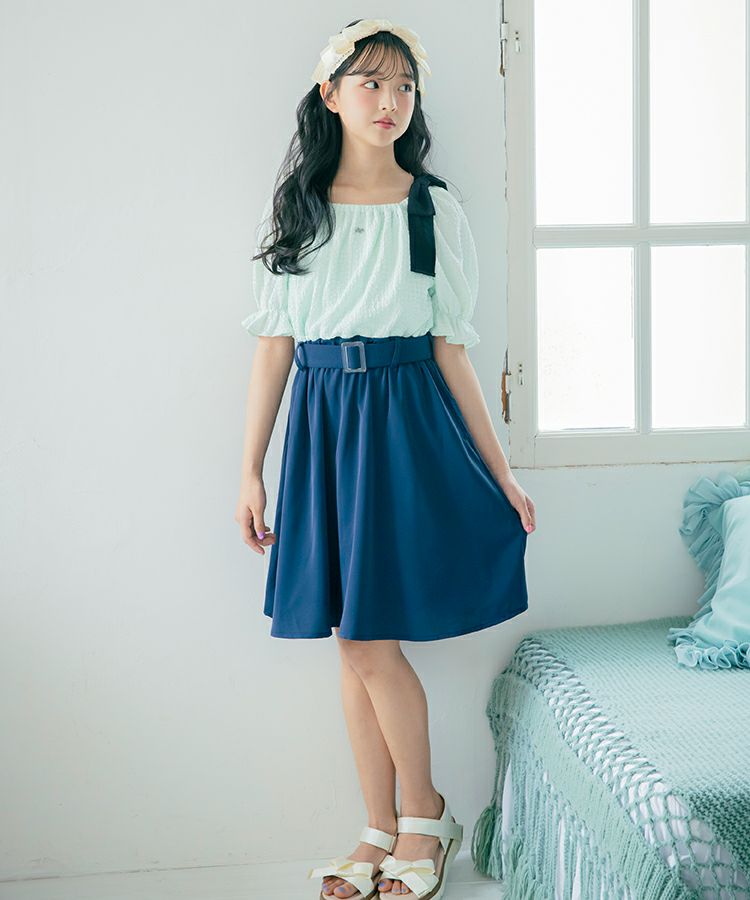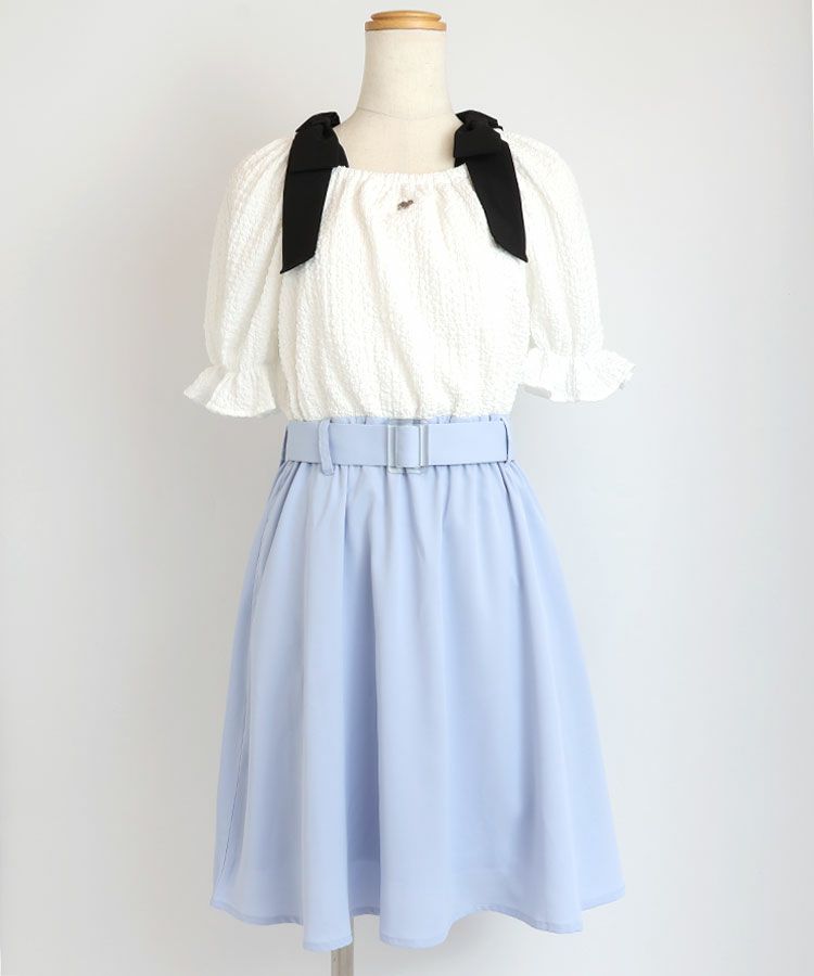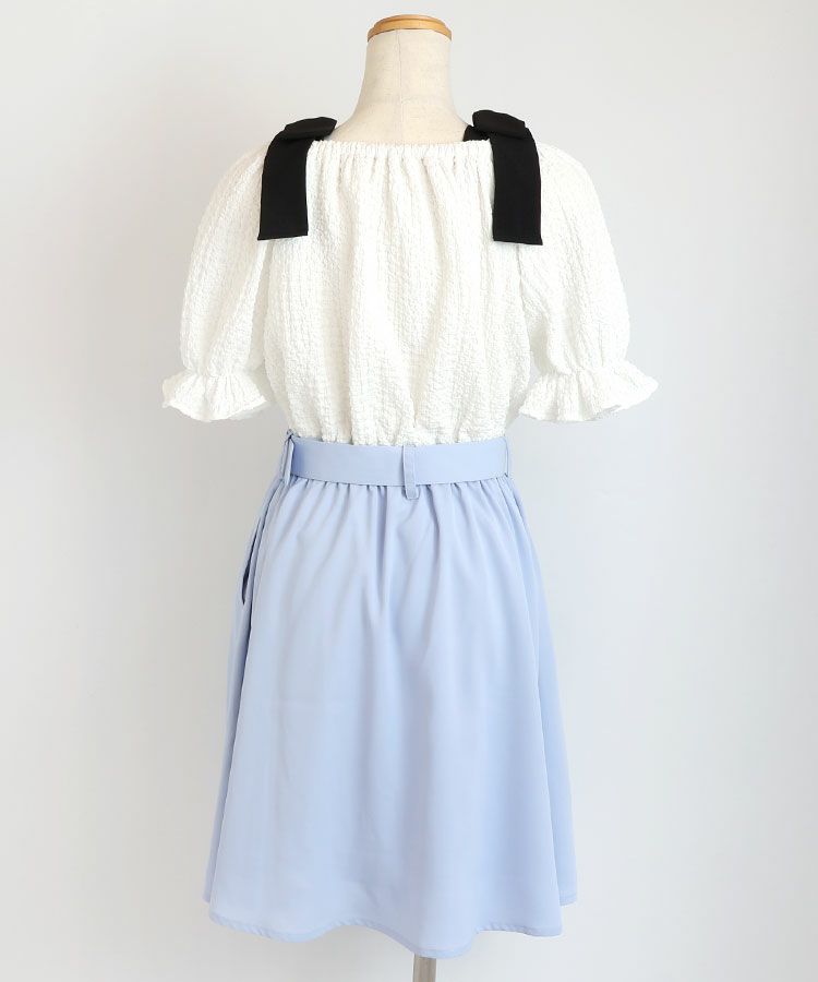 大きなリボンが特徴的なドッキングワンピースの登場です。トップスは表面感のある素材、ボトムはさらっとした素材です。肩のリボンは取り外しが可能でオフショルにして着用もできます。