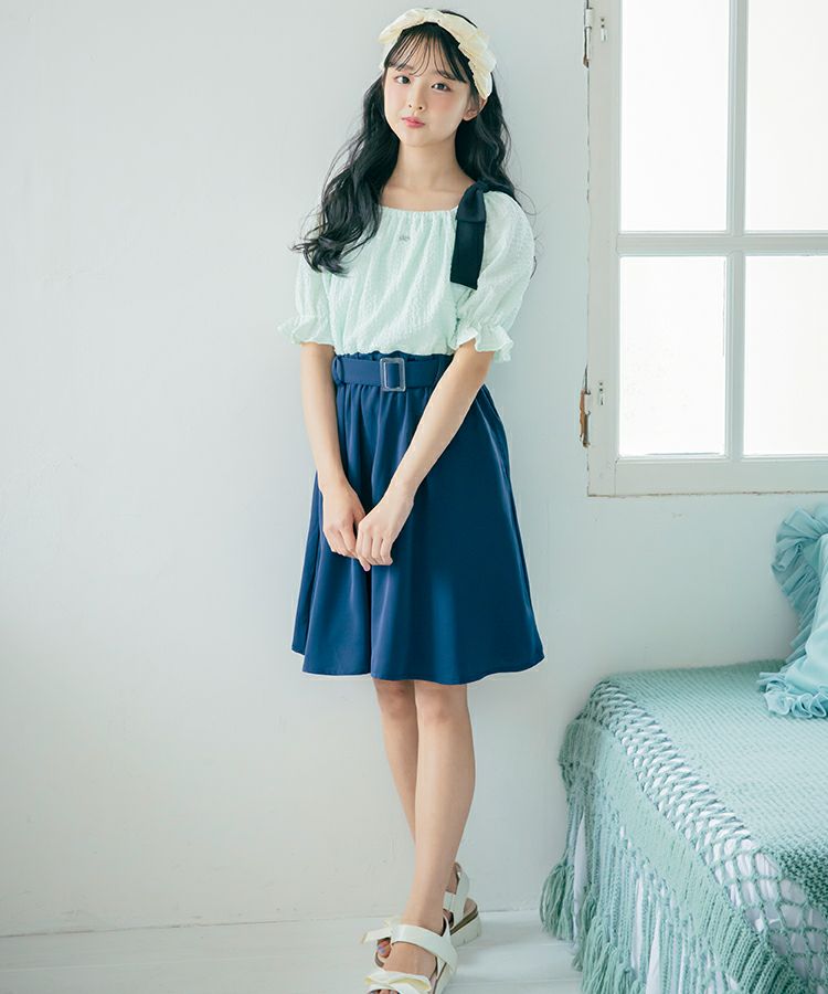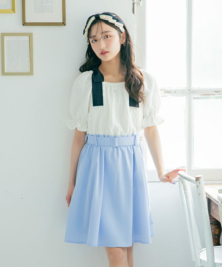 リボンをつけたままオフショルにしたりマルチな着こなしが楽しめます。ウエストマークができるベルトがついているのでスタイルがよく見えるのもポイントです。