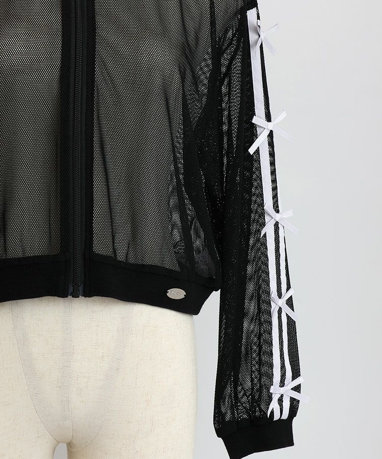■デザイン 涼し気なメッシュ地のトラックジャケットをトレンドのメッシュ地で仕立てました。通気性と肌見せで見た目も着心地も爽やかなアウターです。スポーティーになりがちなライン使いの袖もリボンをつけてガーリーに。