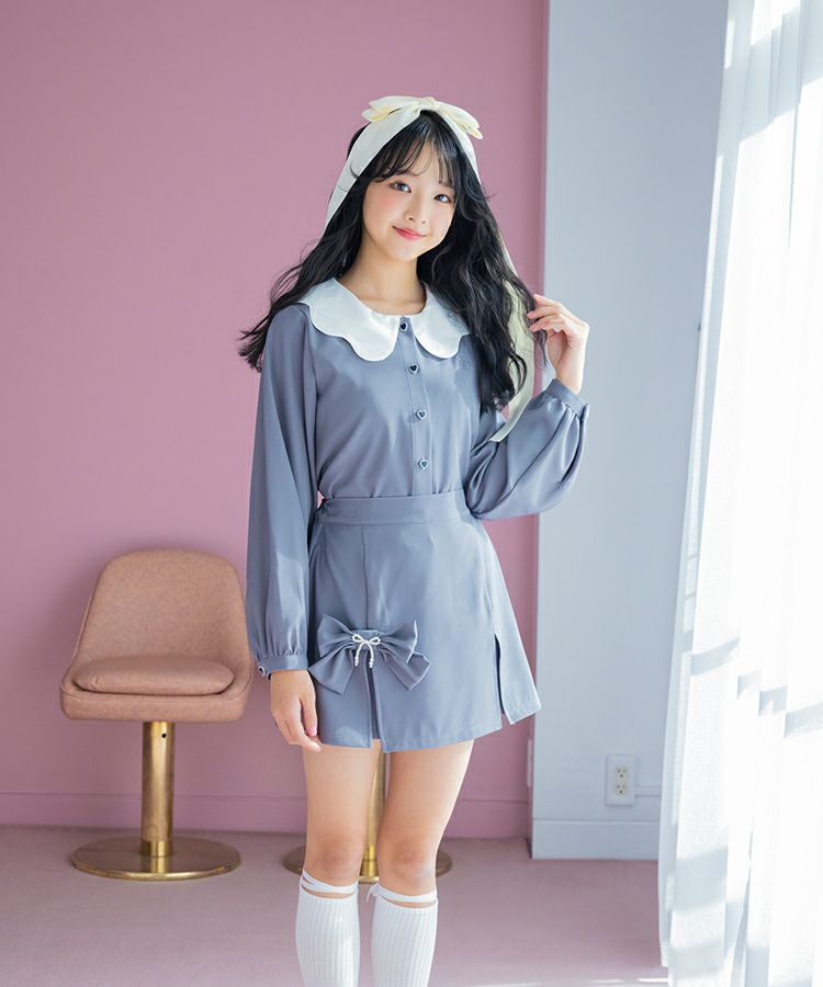 ■デザイン きらっとボタンとこだわりのえりデザインがポイントのトップスとスカート見えするキュロットパンツとのセットアイテム。ハートボタンやパールリボンがガーリーモードを高めてくれます。