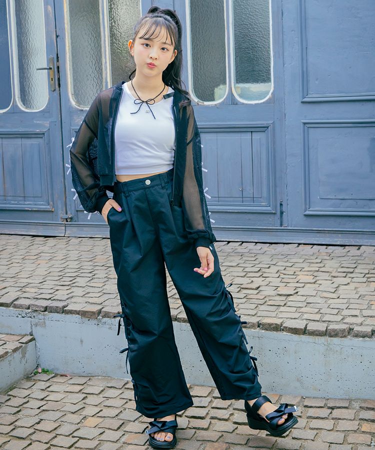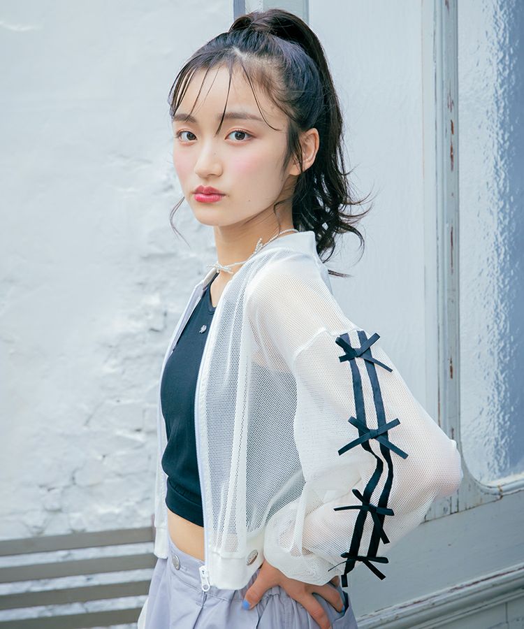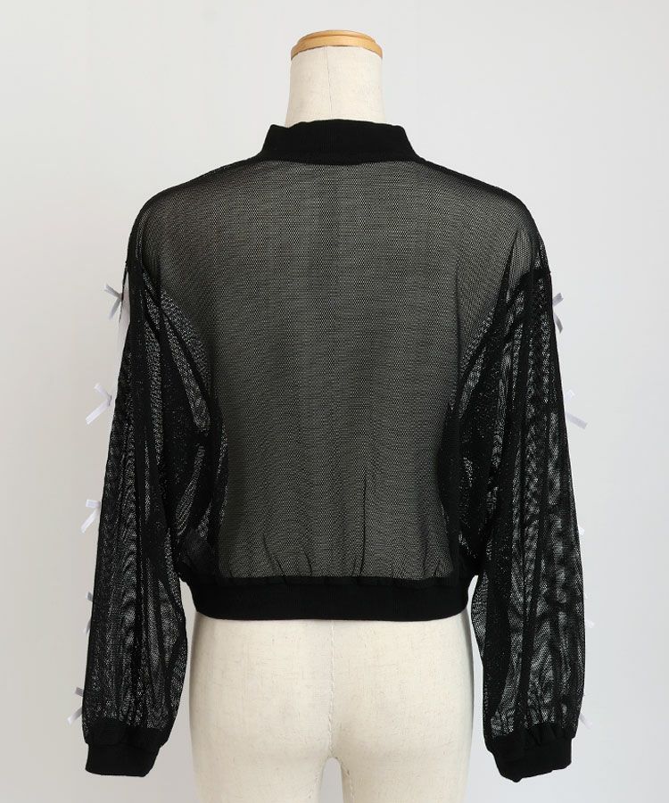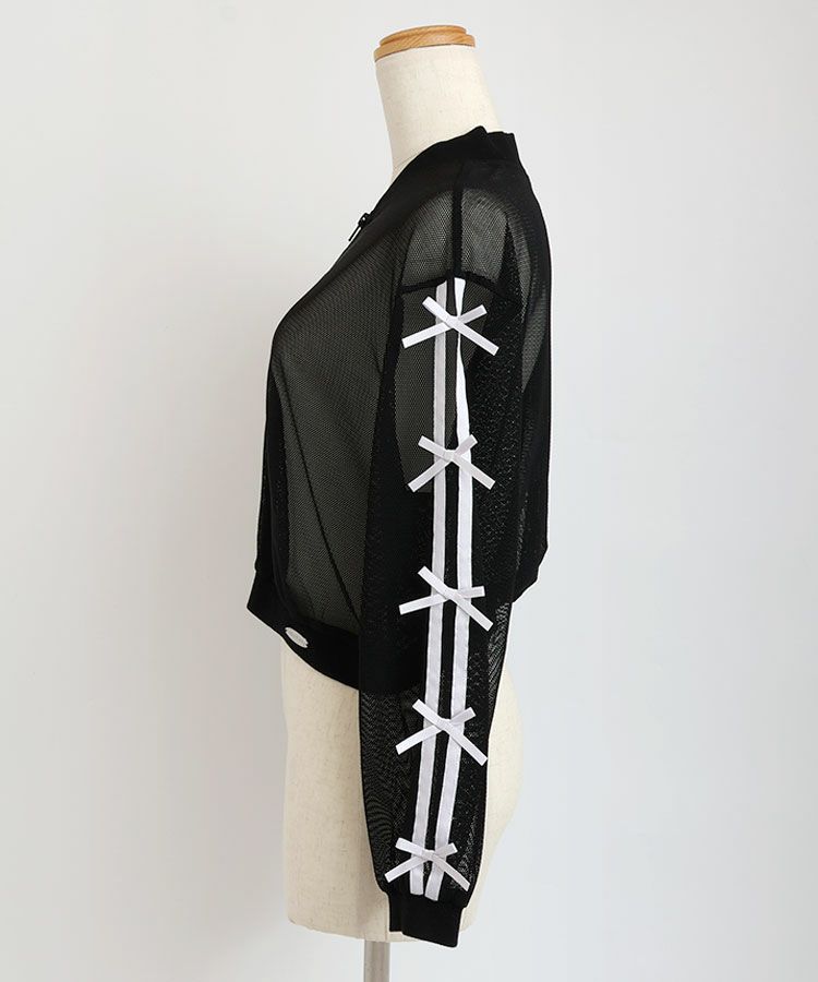 ■デザイン 涼し気なメッシュ地のトラックジャケットをトレンドのメッシュ地で仕立てました。通気性と肌見せで見た目も着心地も爽やかなアウターです。スポーティーになりがちなライン使いの袖もリボンをつけてガーリーに。