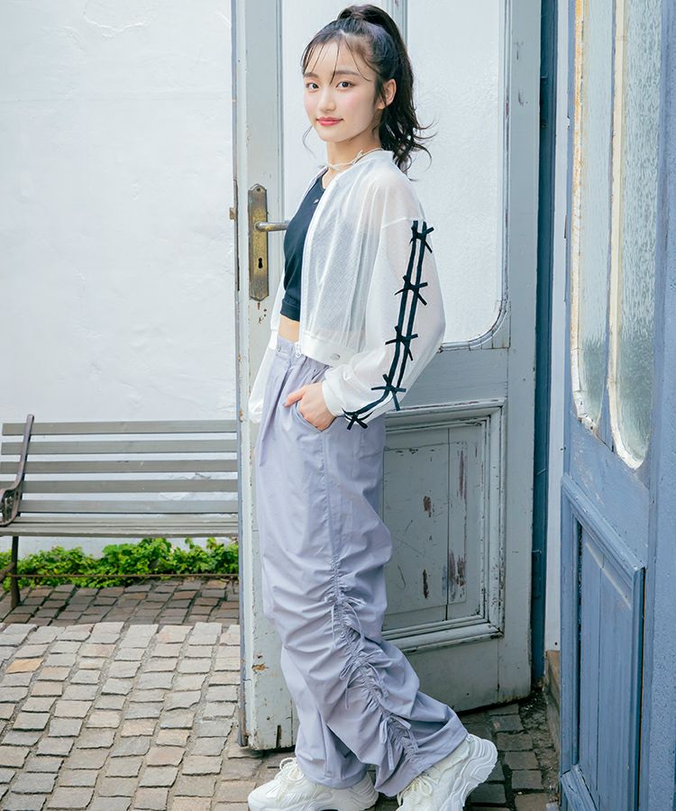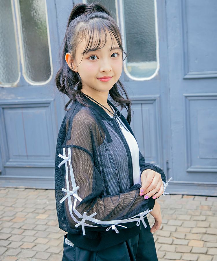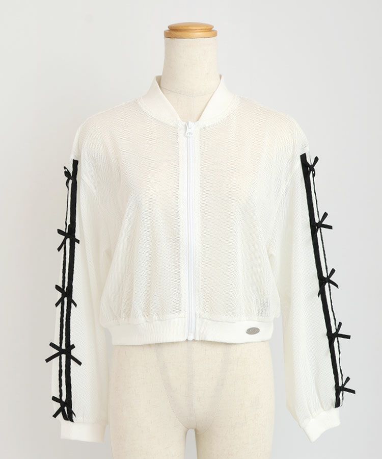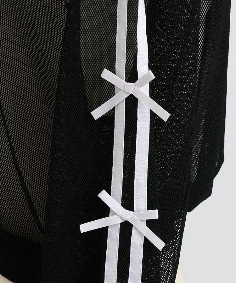 ■デザイン 涼し気なメッシュ地のトラックジャケットをトレンドのメッシュ地で仕立てました。通気性と肌見せで見た目も着心地も爽やかなアウターです。スポーティーになりがちなライン使いの袖もリボンをつけてガーリーに。