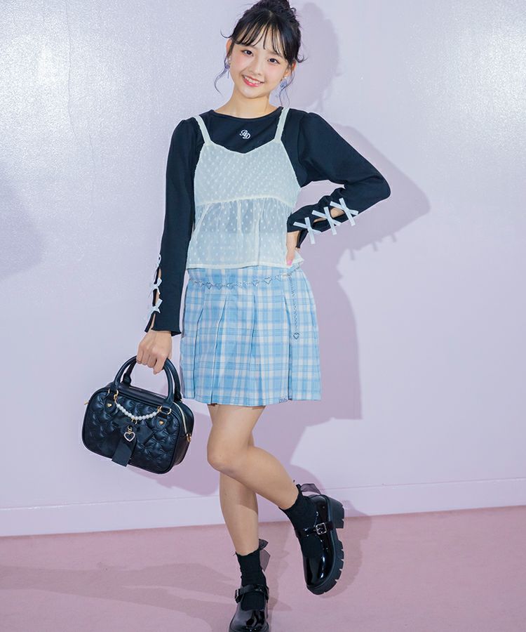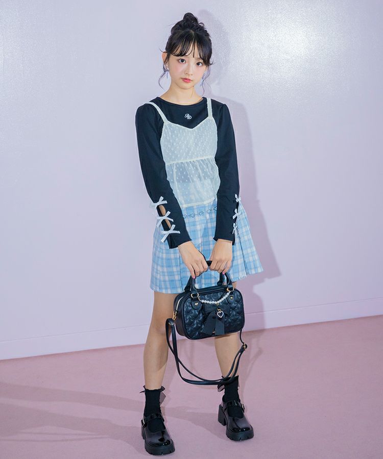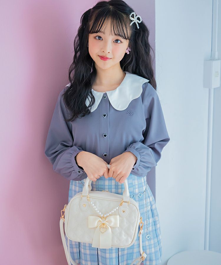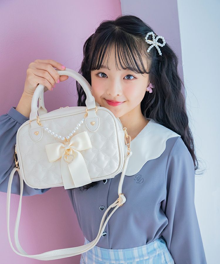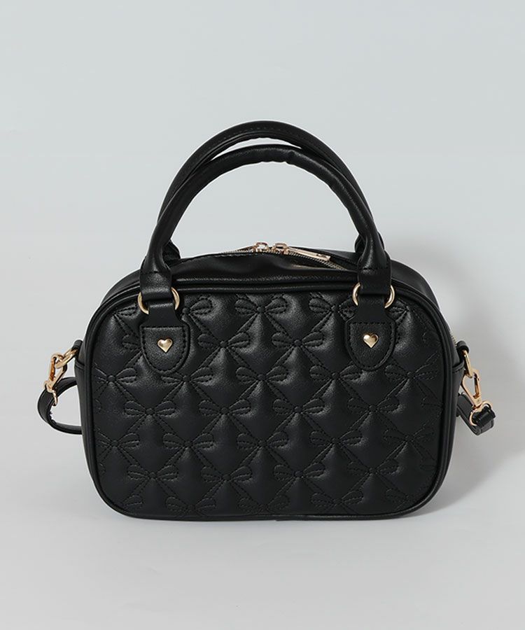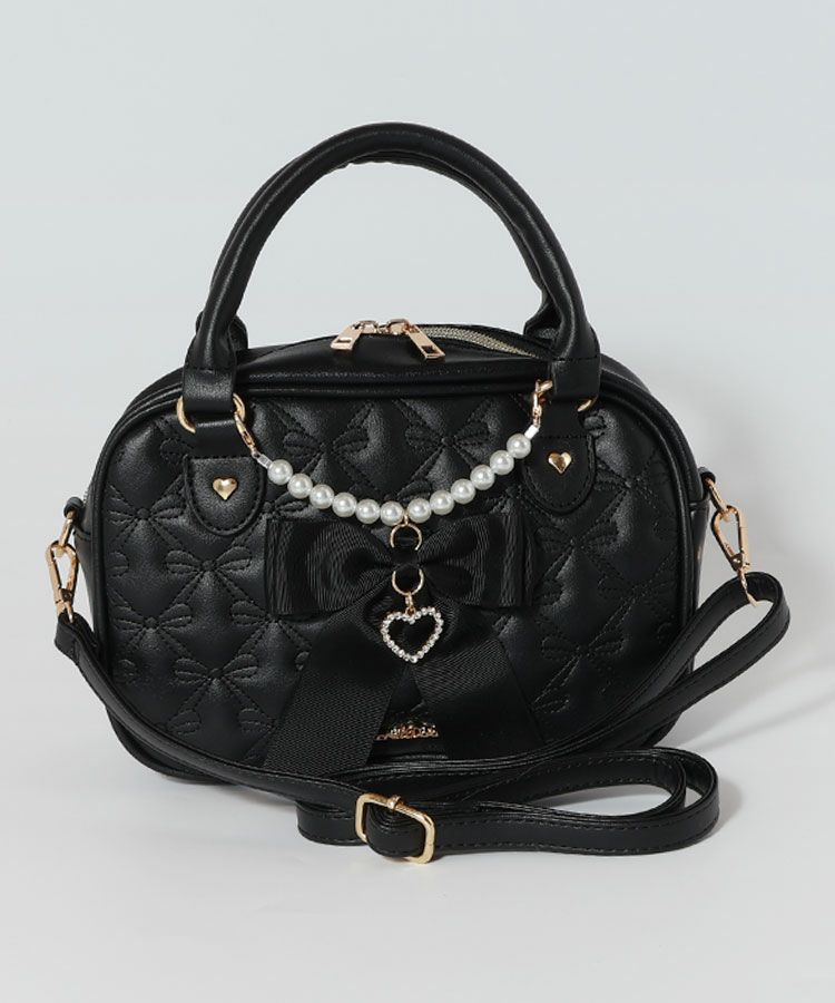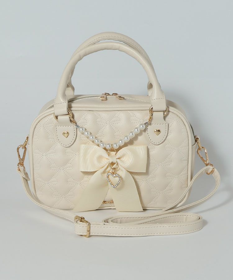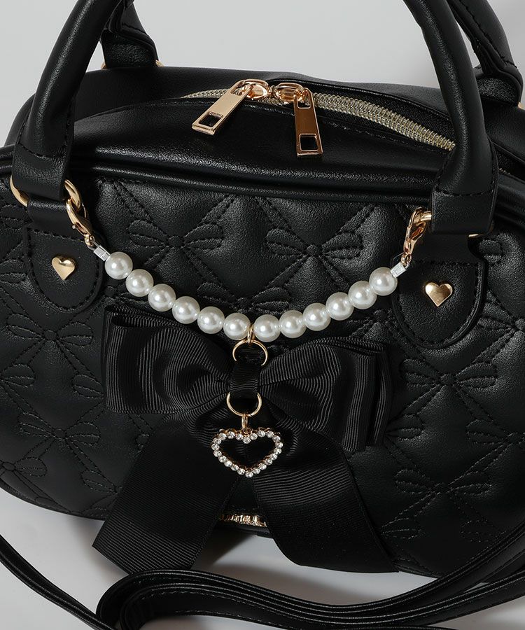リボン柄のキルティングがトレンドライクなミニボストンはショルダーバッグにもなる2WAY仕様。ハートとパールのチャームは取り外せるのでコーデに合わせて使えるのがうれしいポイント♡