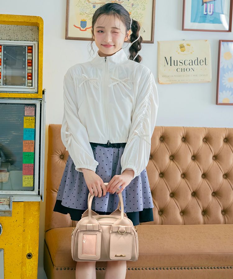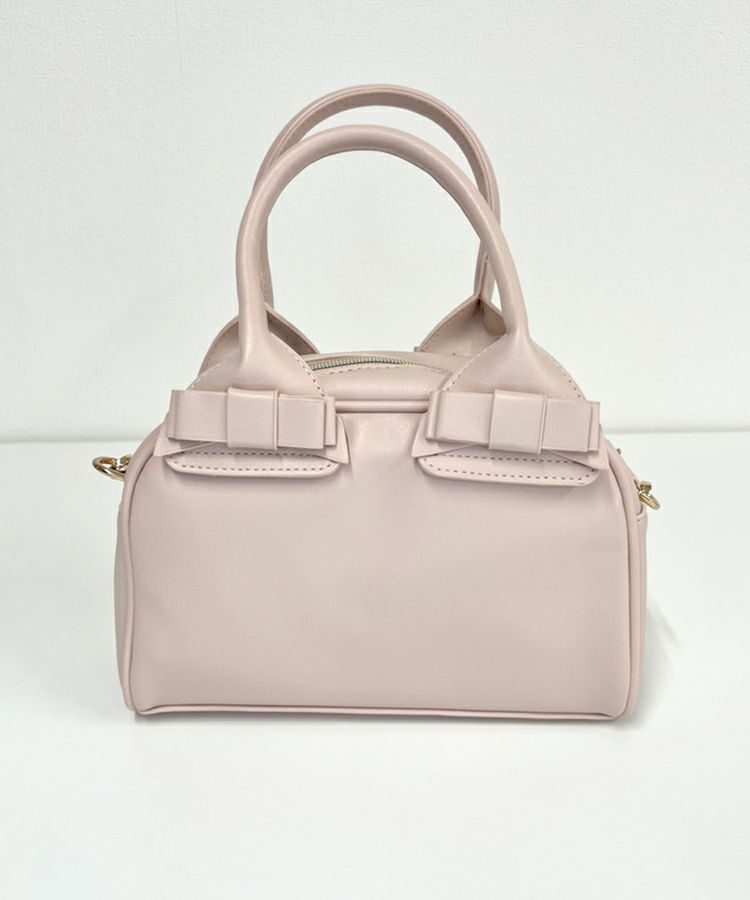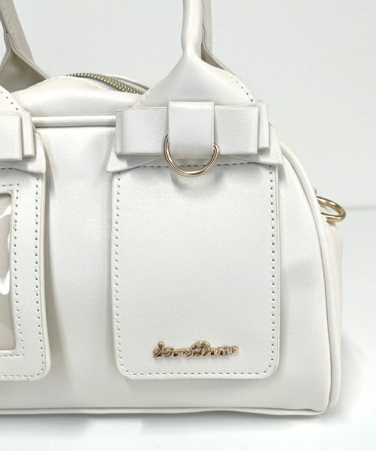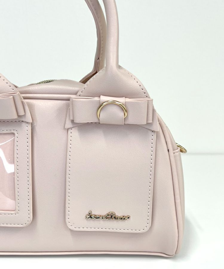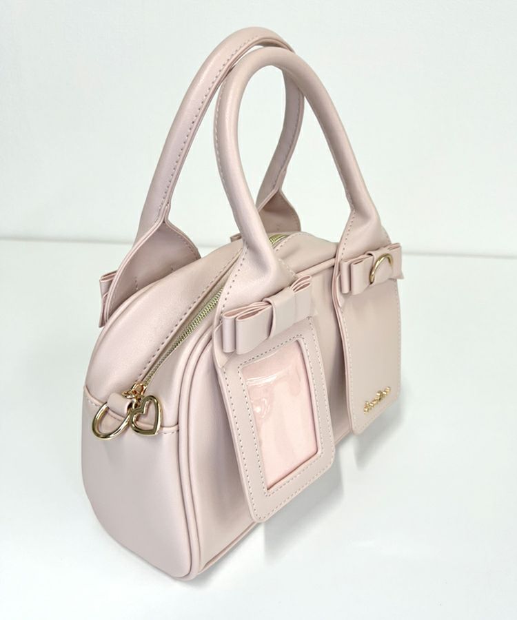 リボンデザインのショルダー付ボストン。内側にはオープンポケット、外側にはフォトカードを入れることができるクリアポケットとキーホルダーが付けられるDカンが付いています。ショルダー紐は取り外しとサイズ調整が可能です。