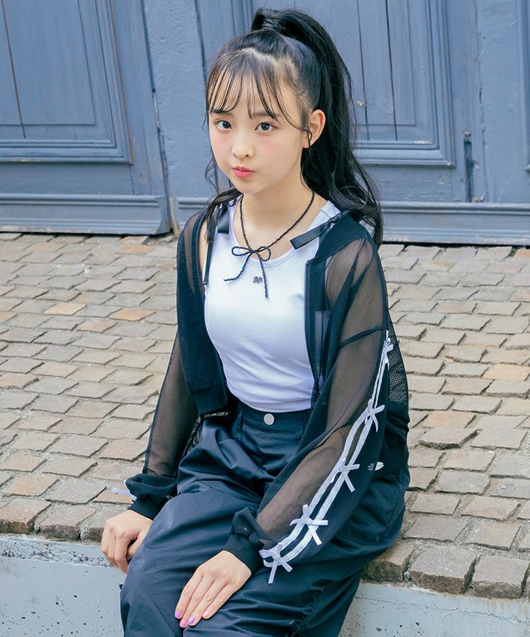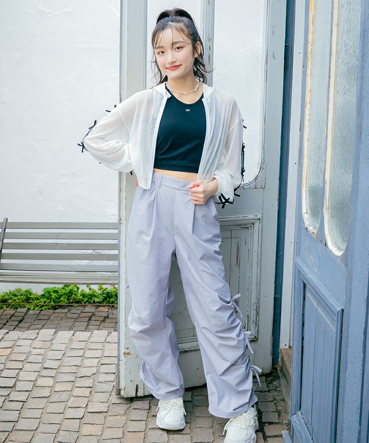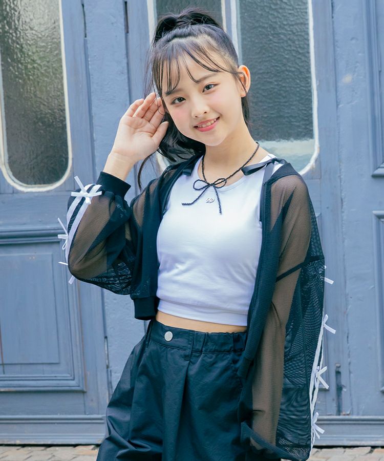 ■デザイン 涼し気なメッシュ地のトラックジャケットをトレンドのメッシュ地で仕立てました。通気性と肌見せで見た目も着心地も爽やかなアウターです。スポーティーになりがちなライン使いの袖もリボンをつけてガーリーに。