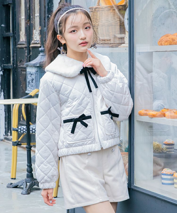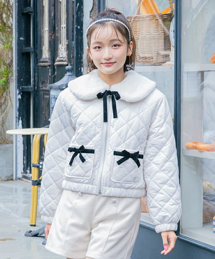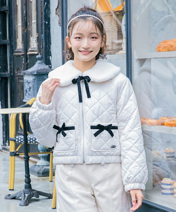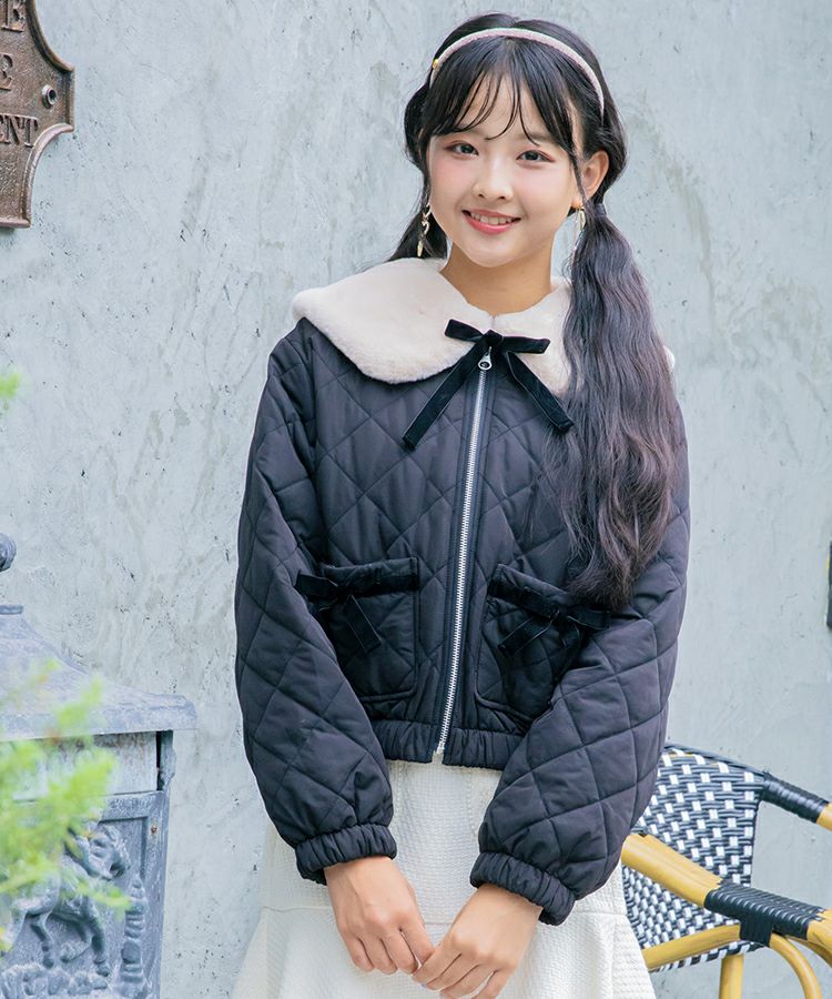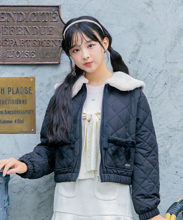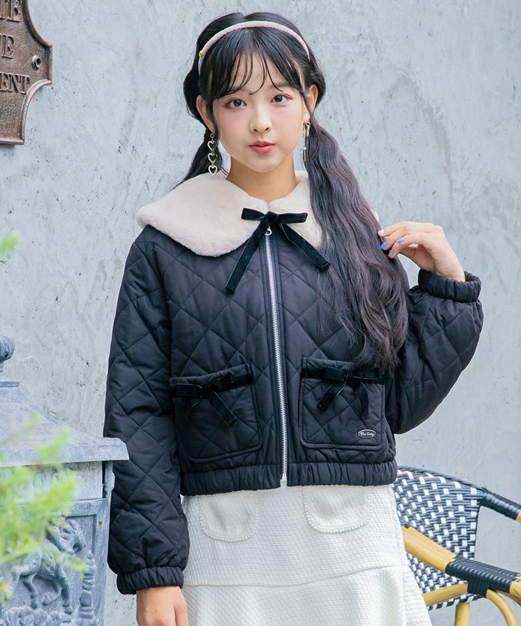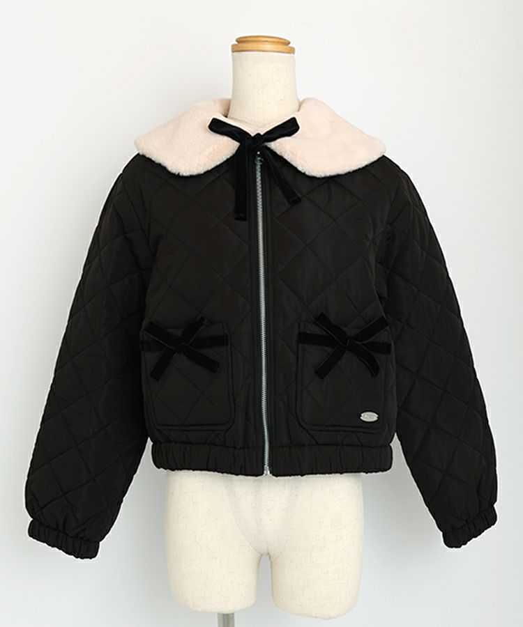 ■デザイン 軽いキルティングの中綿ブルゾンは取り外しができるファーティペット付き。ポケットとティペットにはベロア調のリボンがついていてお上品な印象に。袖口とウエストにはゴムが入っているので防寒もばっちりです。ボリュームとシルエットにもこだわりが光ります。