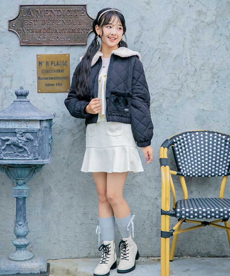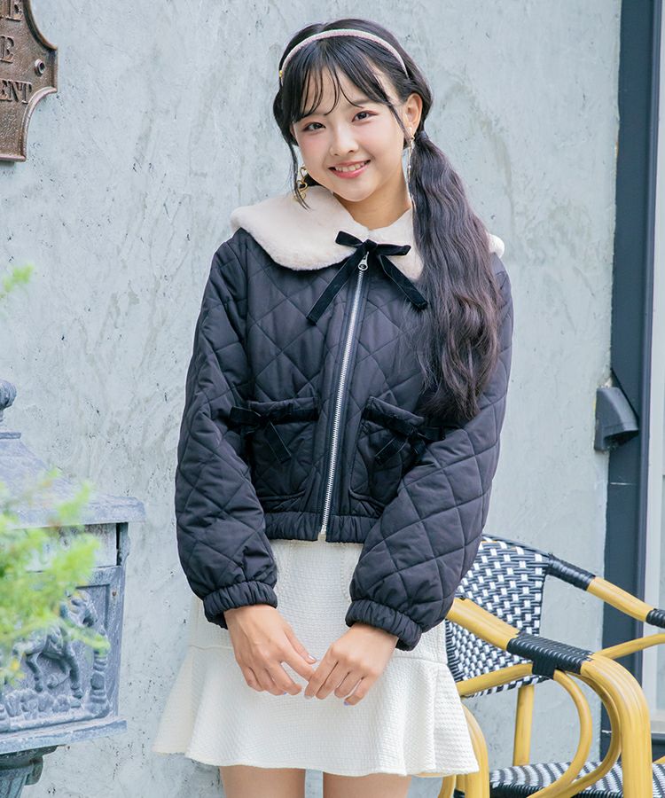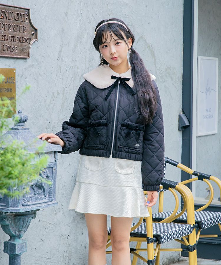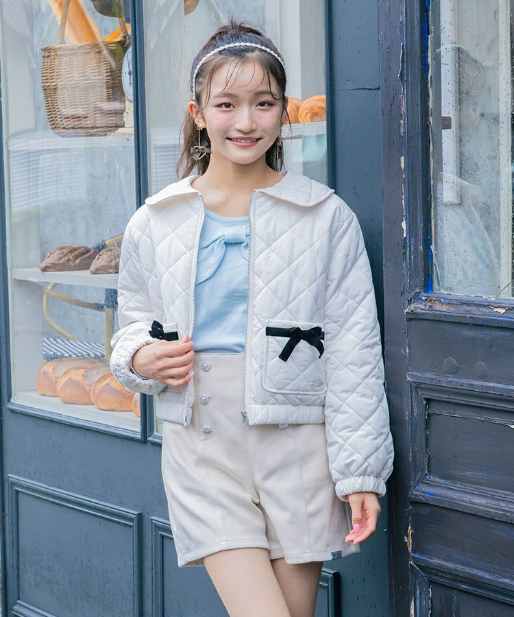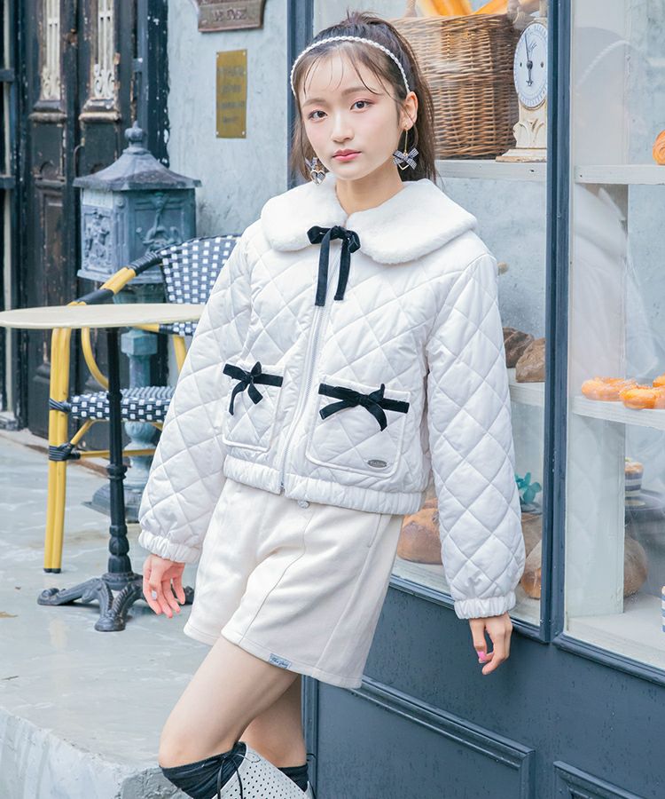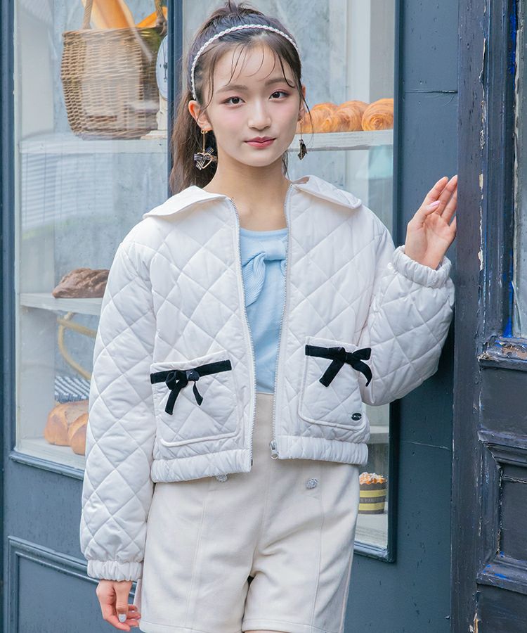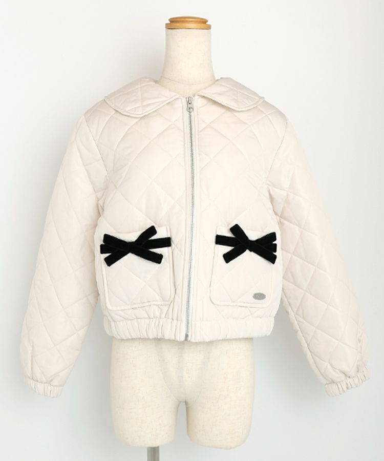 ■デザイン 軽いキルティングの中綿ブルゾンは取り外しができるファーティペット付き。ポケットとティペットにはベロア調のリボンがついていてお上品な印象に。袖口とウエストにはゴムが入っているので防寒もばっちりです。ボリュームとシルエットにもこだわりが光ります。
