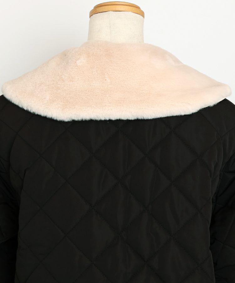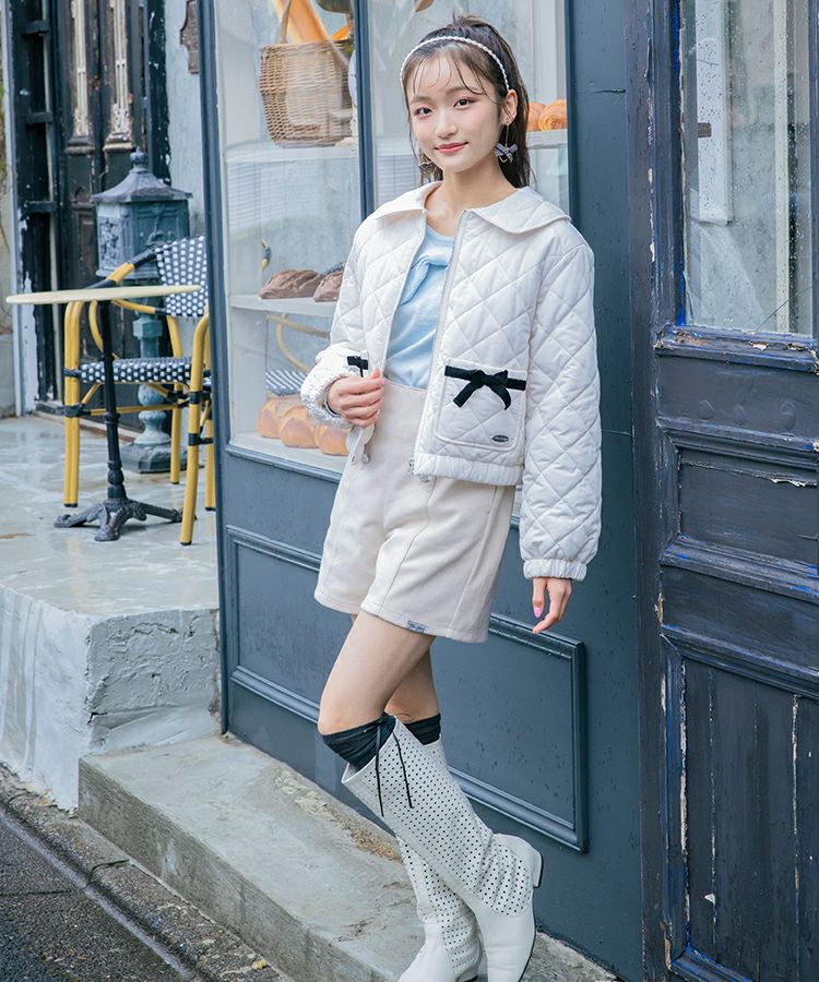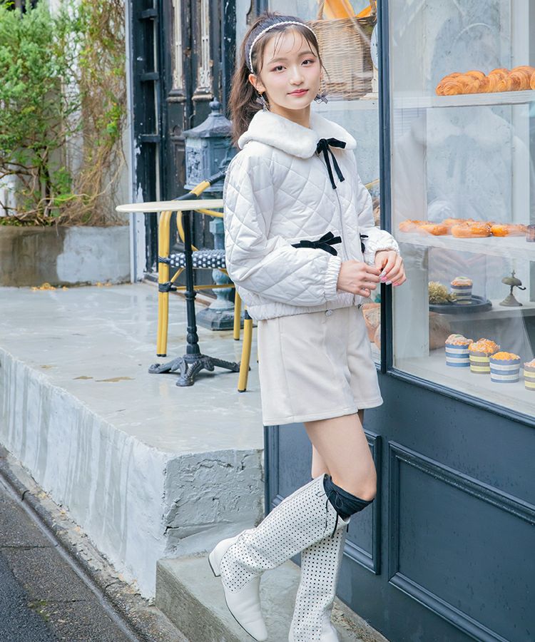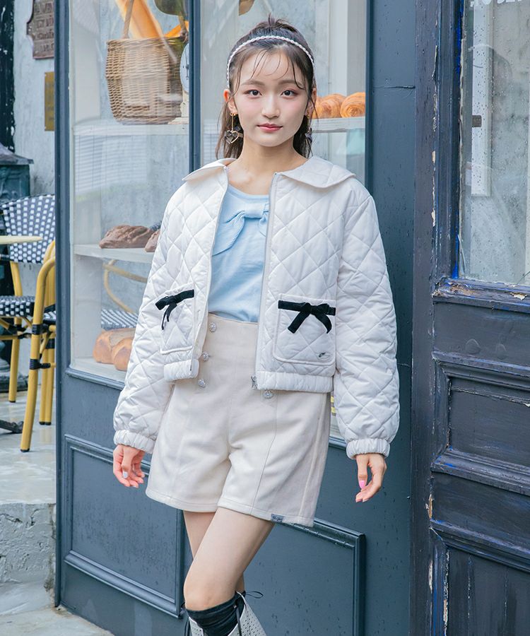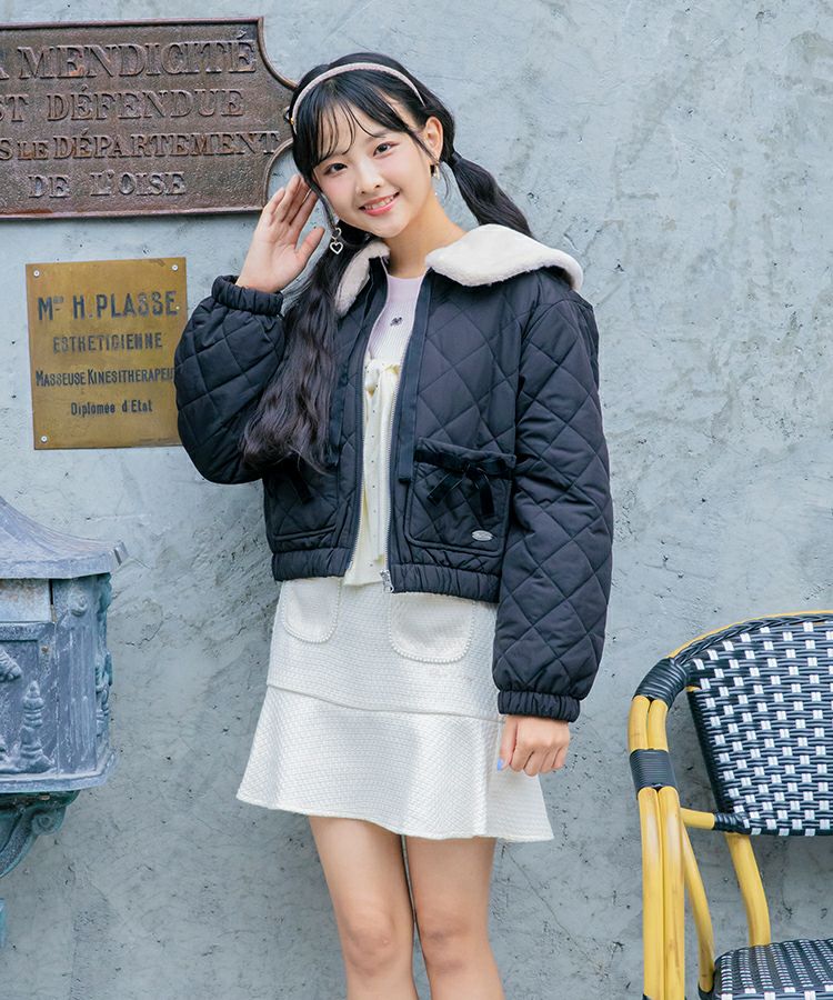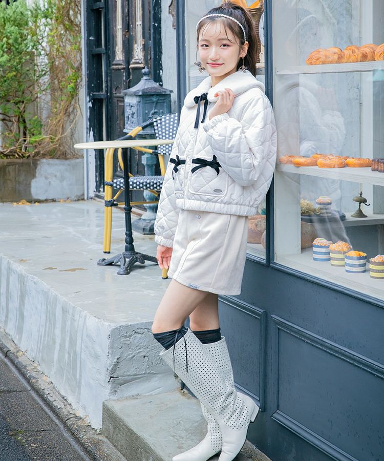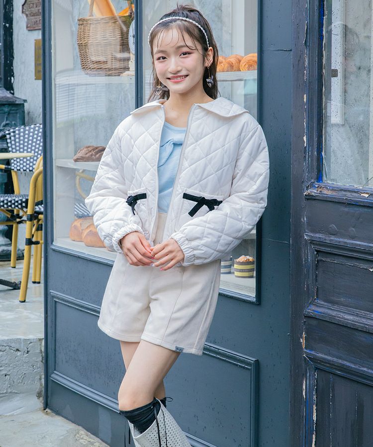 ■デザイン 軽いキルティングの中綿ブルゾンは取り外しができるファーティペット付き。ポケットとティペットにはベロア調のリボンがついていてお上品な印象に。袖口とウエストにはゴムが入っているので防寒もばっちりです。ボリュームとシルエットにもこだわりが光ります。