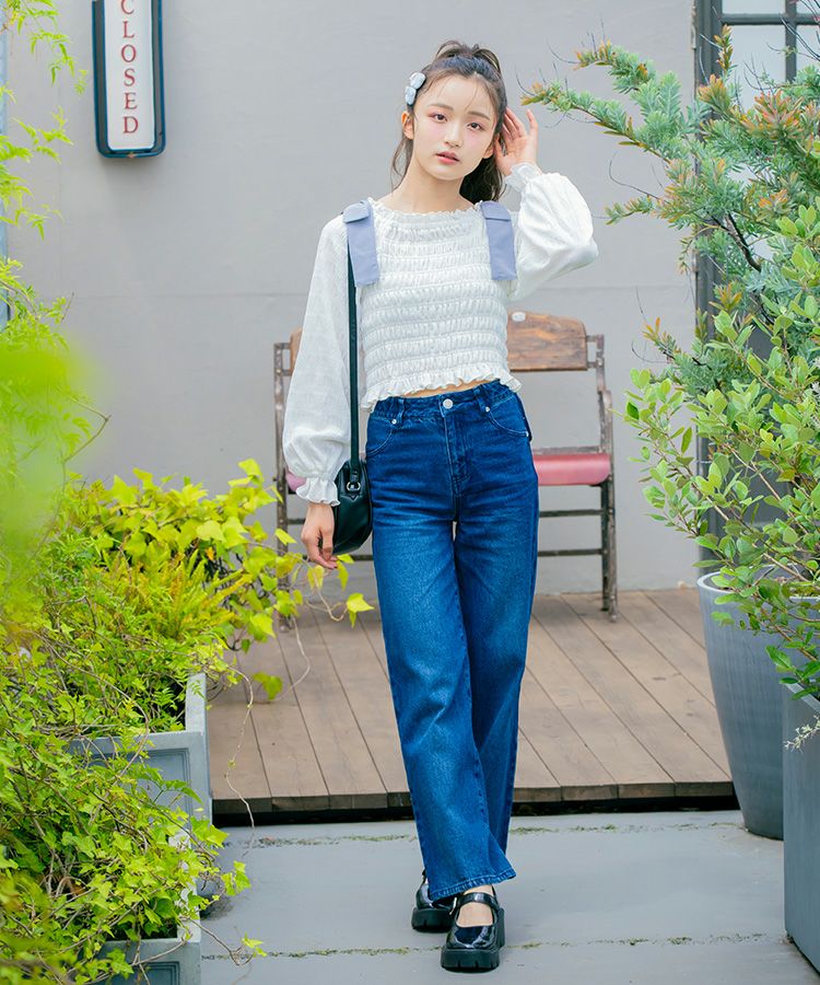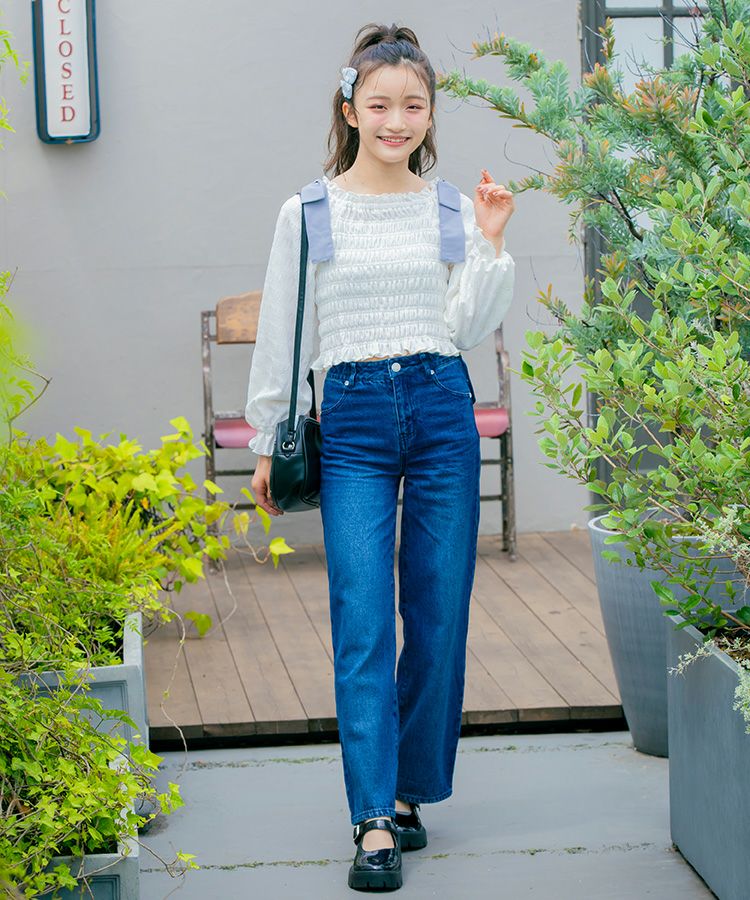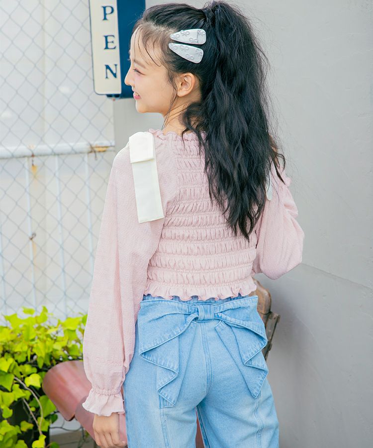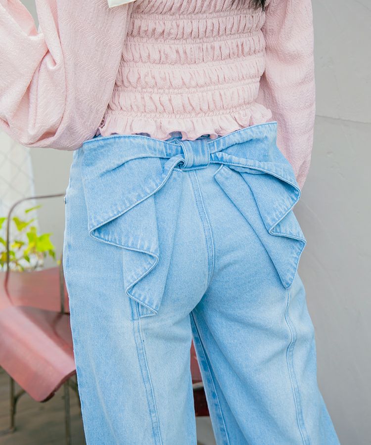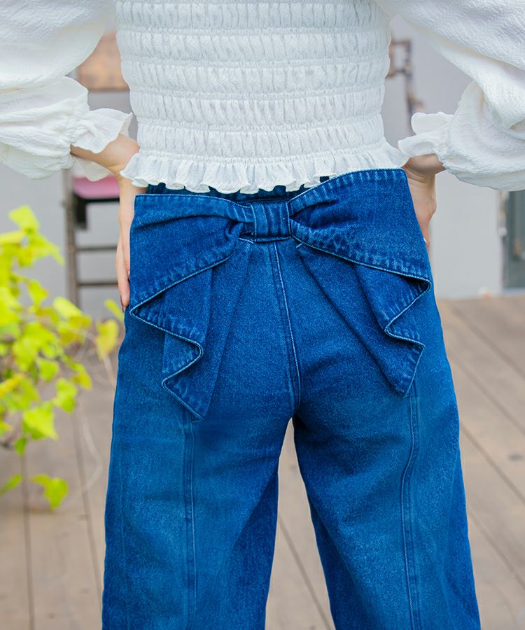 バックリボンデニムが待望のロングパンツバージョンで登場です。大人気だったショートパンツをそのままロングにしたのではなくリボン位置や大きさを一から見直しました。フロントのポケットにはキラリと光るストーンがついていてお上品な仕上がりに。前開きのデザインもボタンではなくフックな着脱時にので爪や指が痛くなりません。