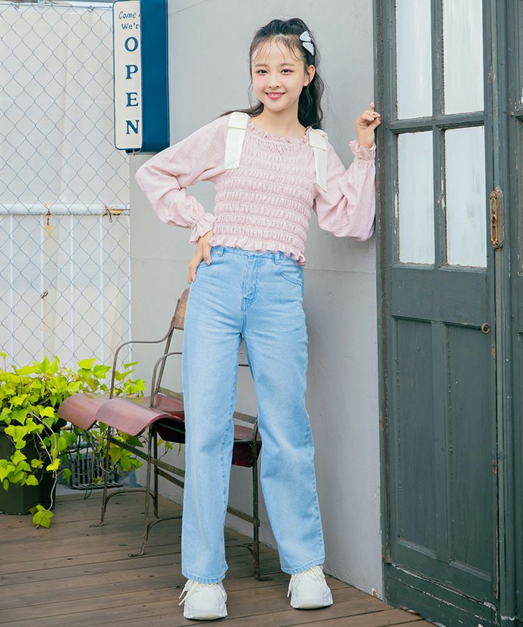 綿100%なのに、とにかく柔らかい生地! 普段デニムが苦手な娘でも履けます🩷 身長140センチで、140サイズ購入。 素足だと下に付く長さですが、靴を履けばちょうど良いです。 すわってもリボンが邪魔にならない位置に付いているのが最高です(⁠≧⁠▽⁠≦⁠)