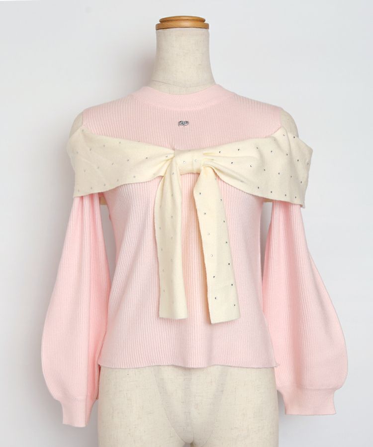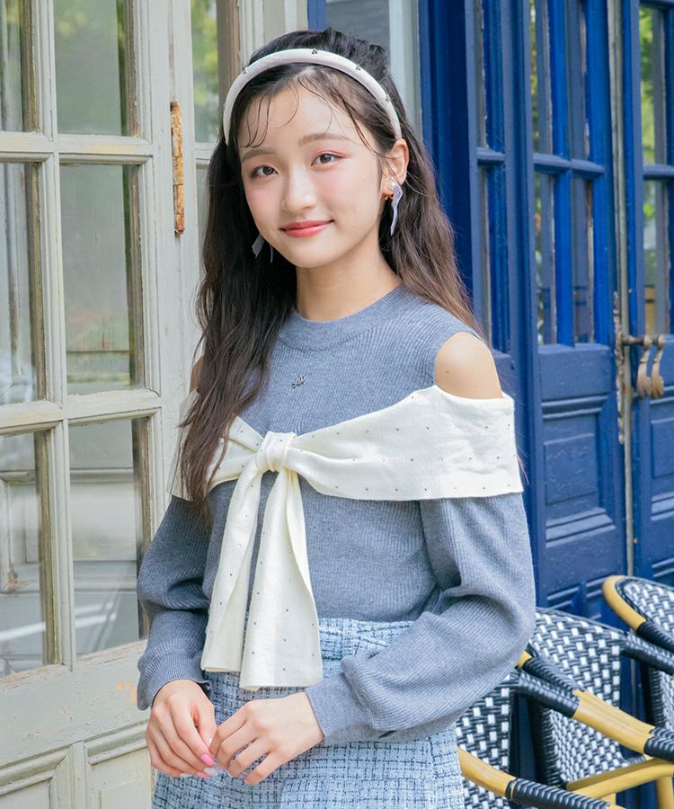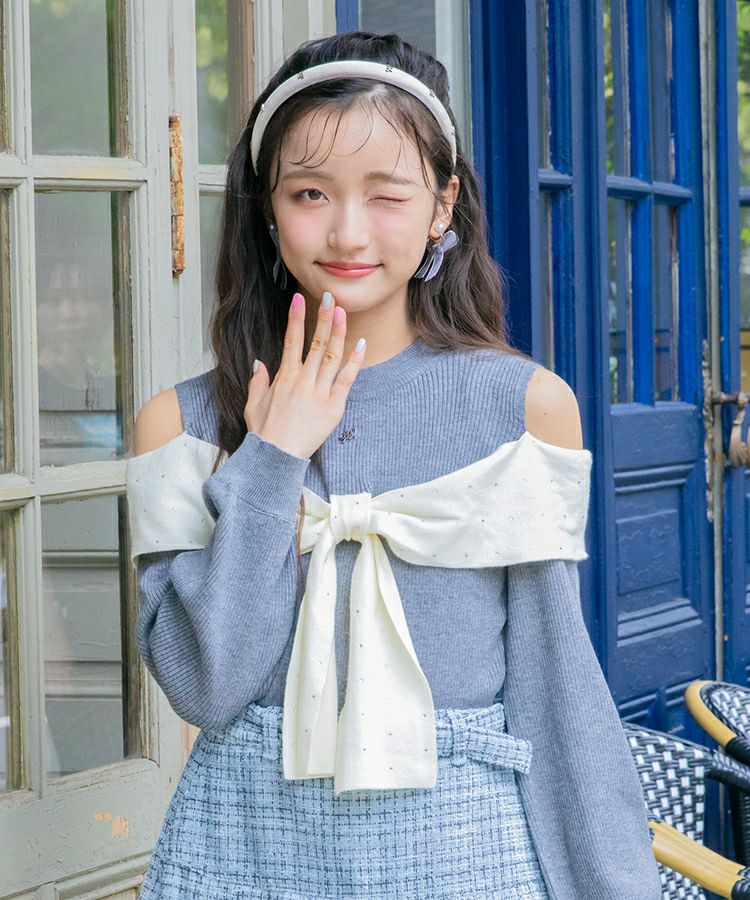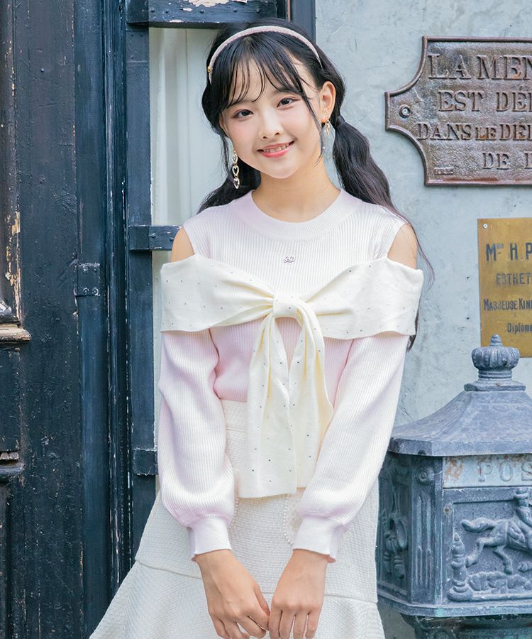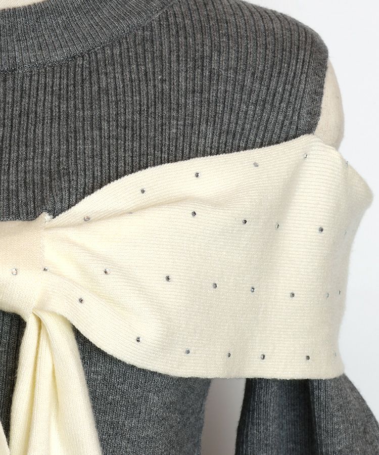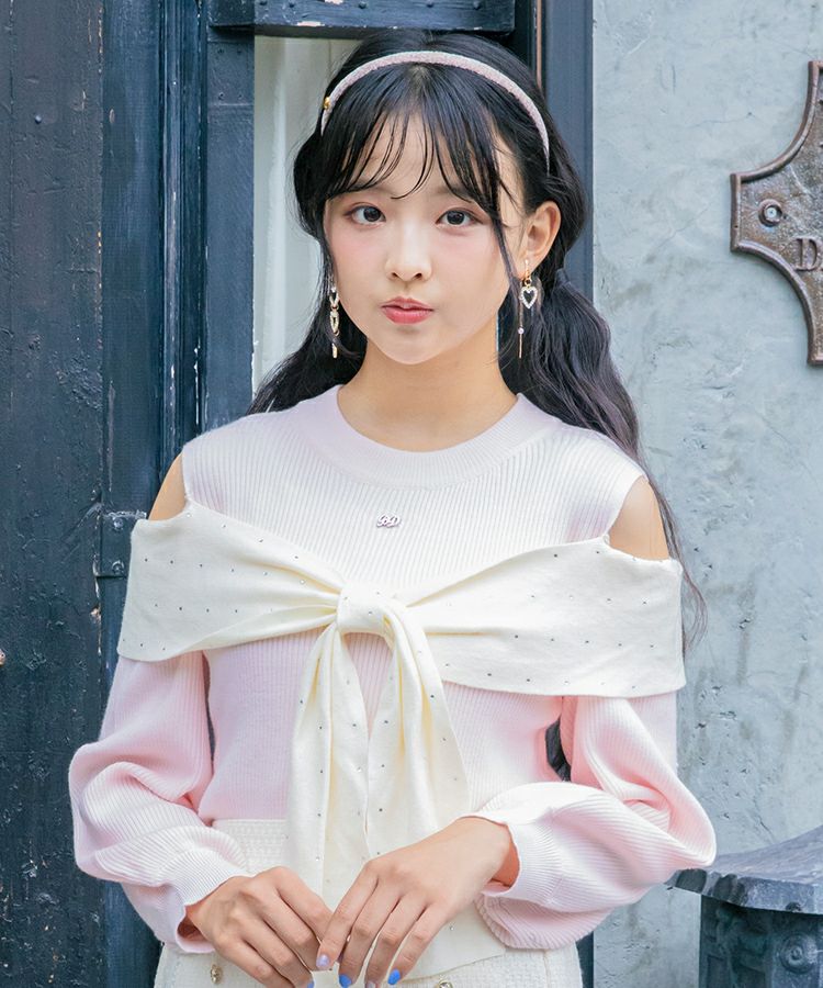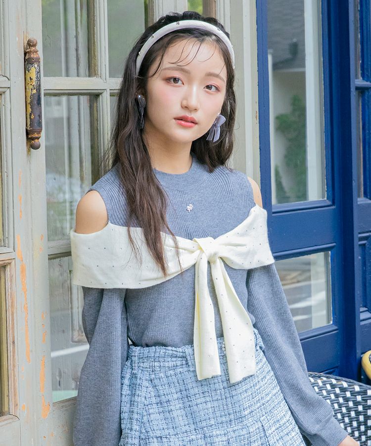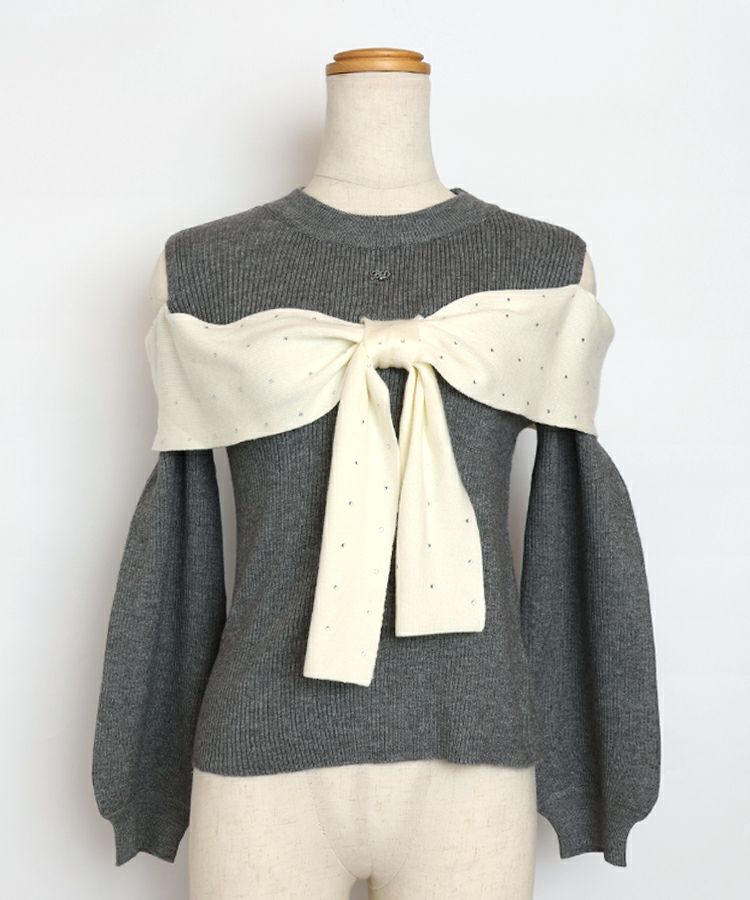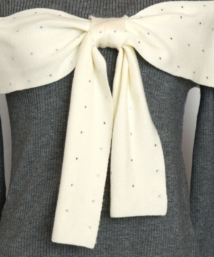 柔らかい肌触りのいいニットが人気の肩あきデザインになって登場です。チクチクしないニットなのでインナーはタンクトップでも問題なく着ていただけます。リボン部分にはラインストーンがついていてとても華やかに仕上がっています。ご家庭でお洗濯いただけるニットです。