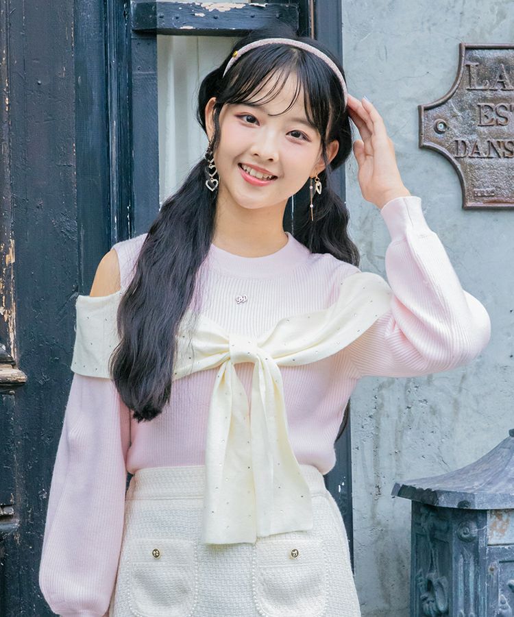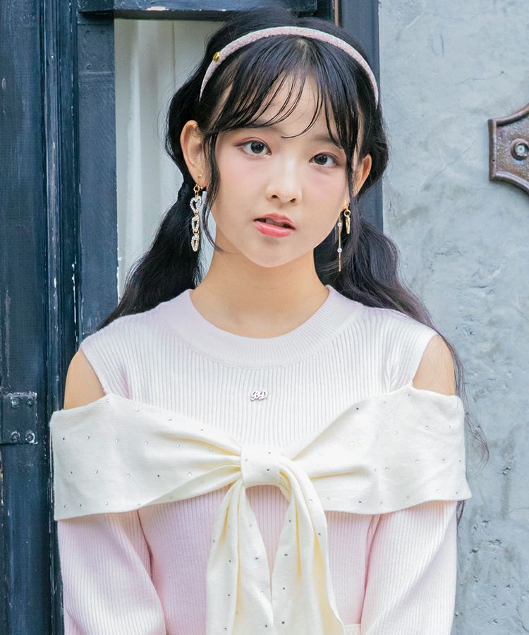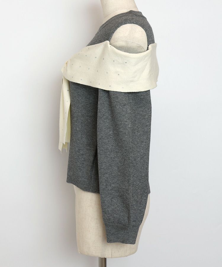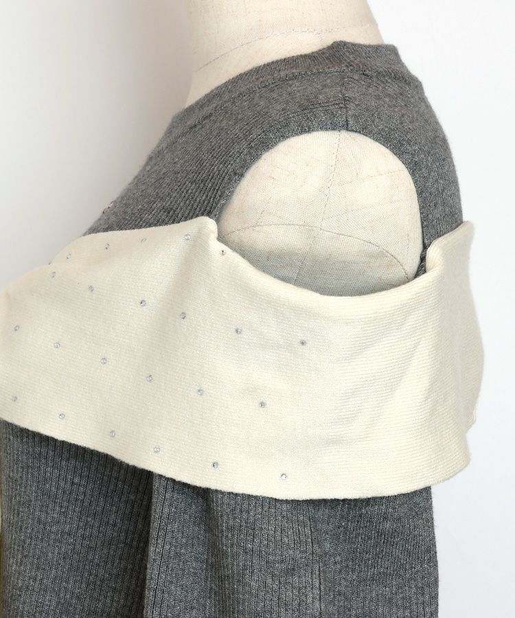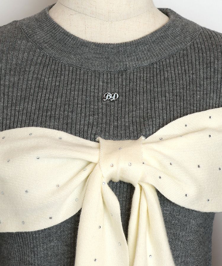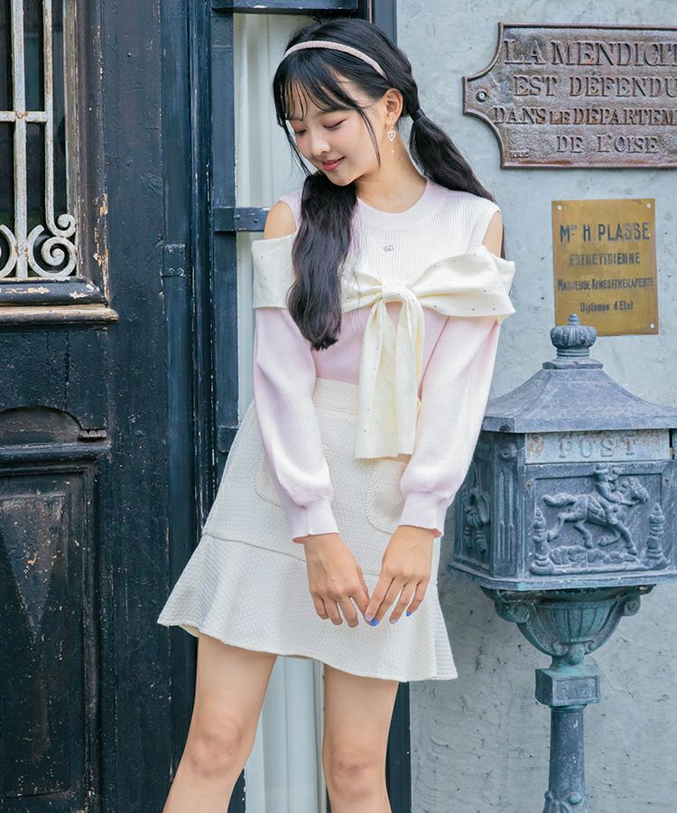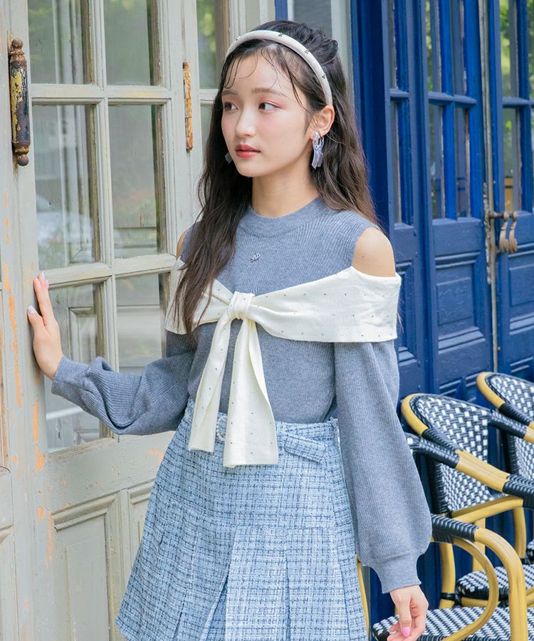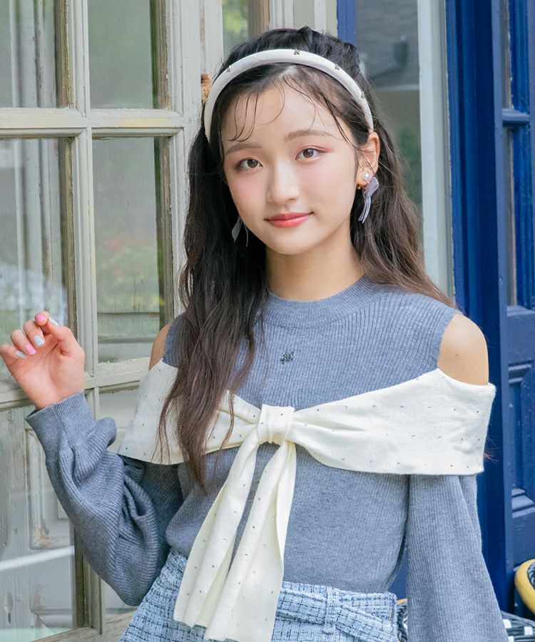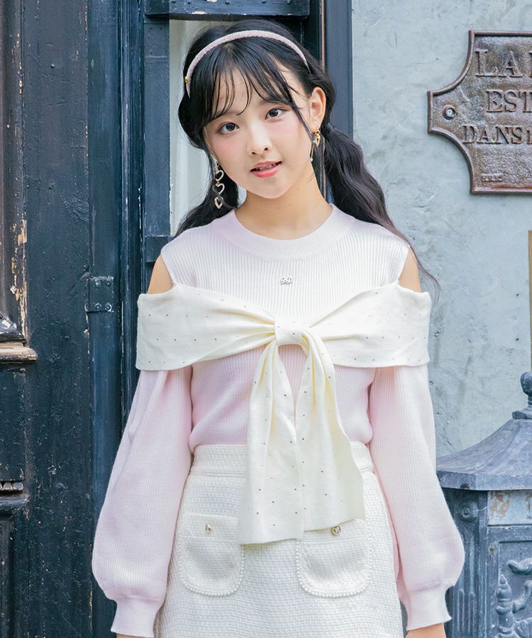 柔らかい肌触りのいいニットが人気の肩あきデザインになって登場です。チクチクしないニットなのでインナーはタンクトップでも問題なく着ていただけます。リボン部分にはラインストーンがついていてとても華やかに仕上がっています。ご家庭でお洗濯いただけるニットです。