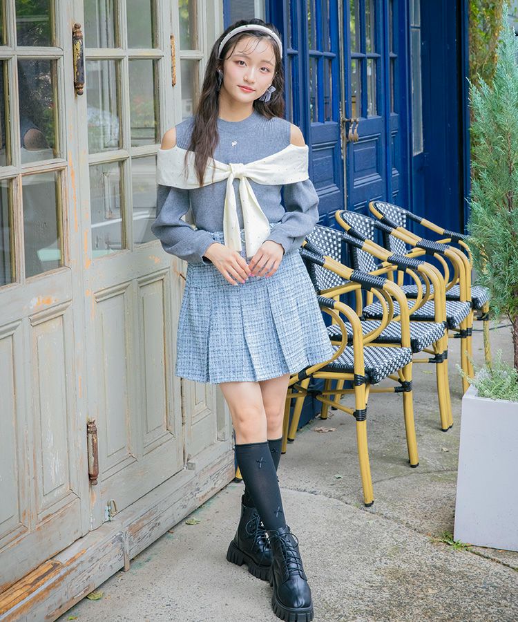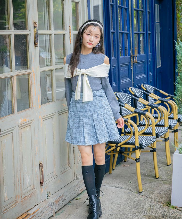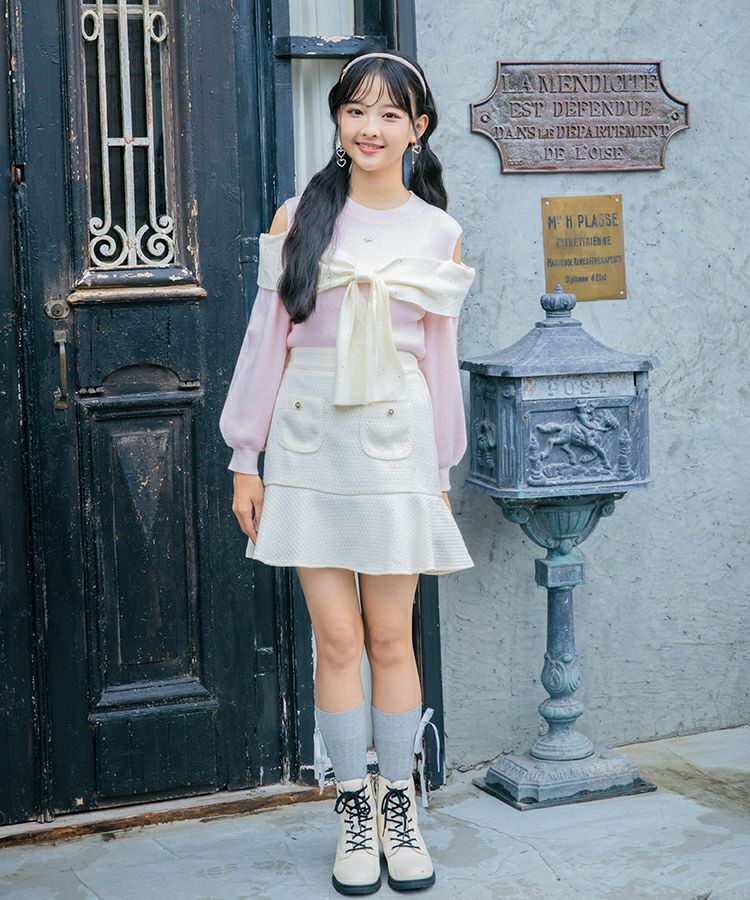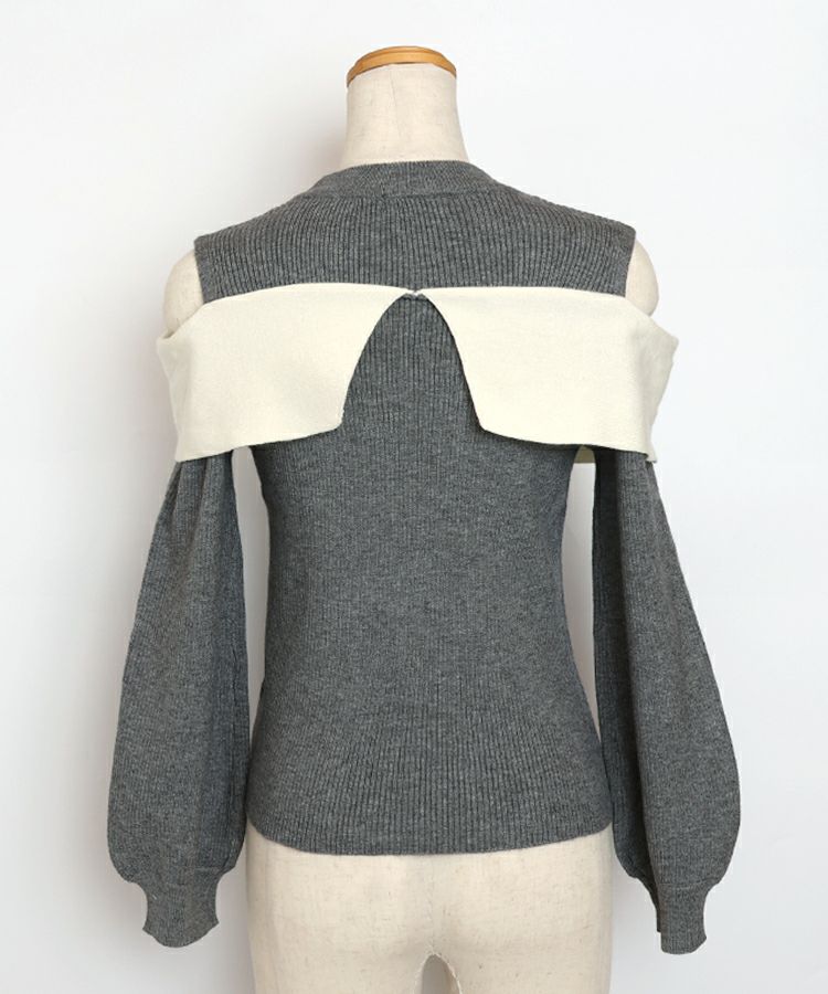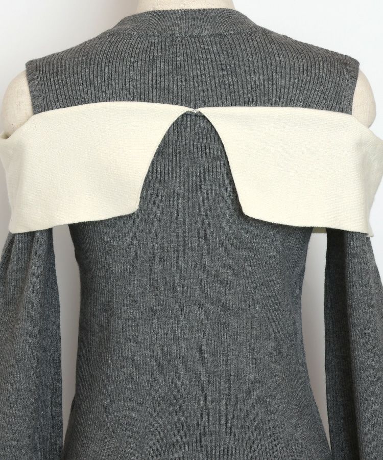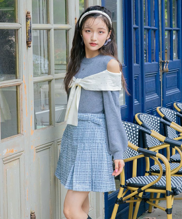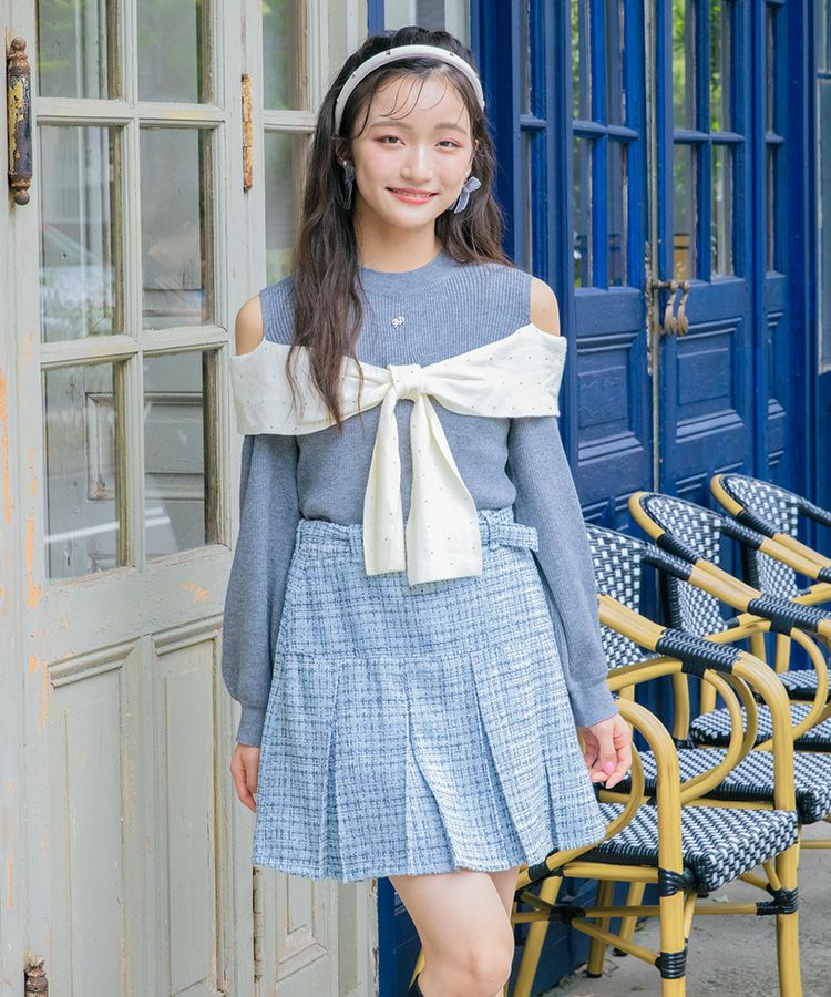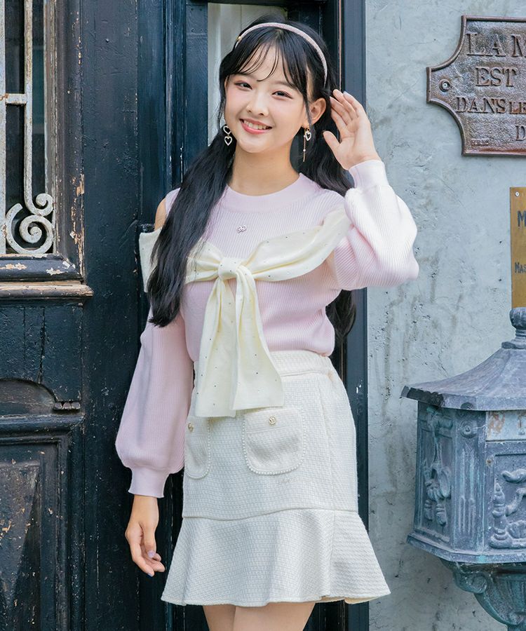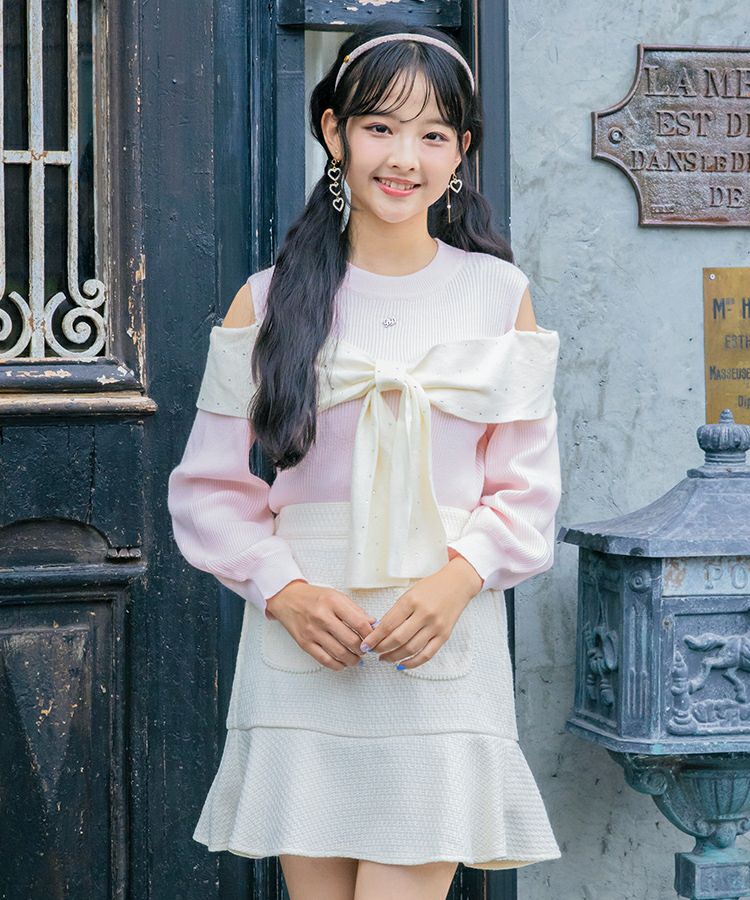 柔らかい肌触りのいいニットが人気の肩あきデザインになって登場です。チクチクしないニットなのでインナーはタンクトップでも問題なく着ていただけます。リボン部分にはラインストーンがついていてとても華やかに仕上がっています。ご家庭でお洗濯いただけるニットです。