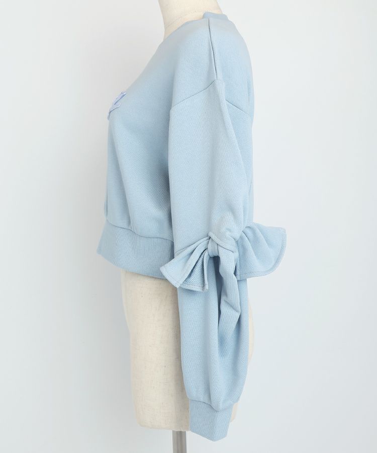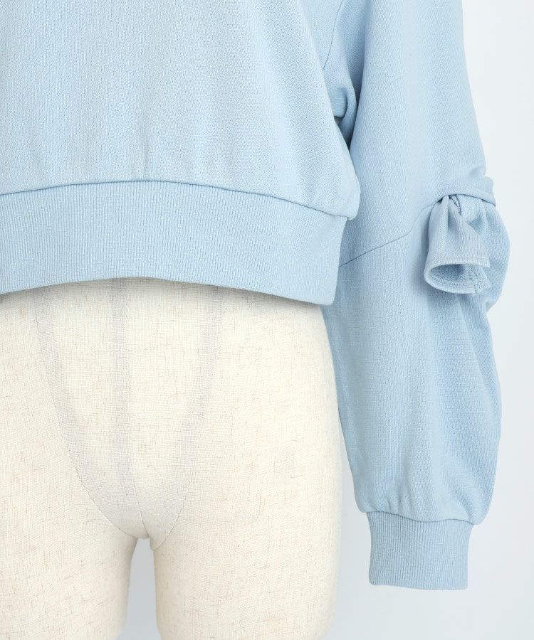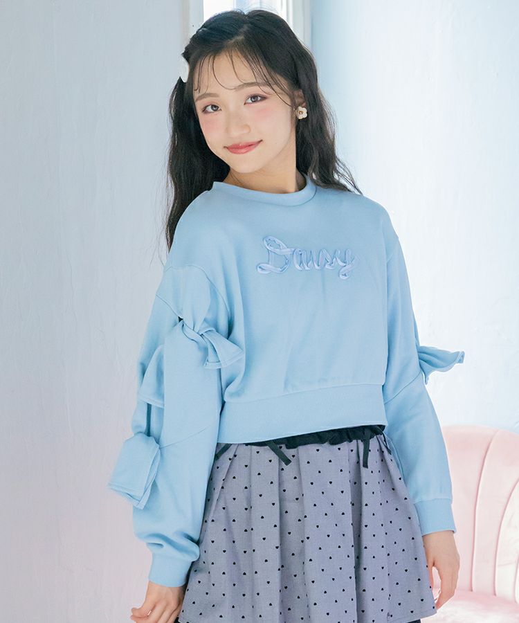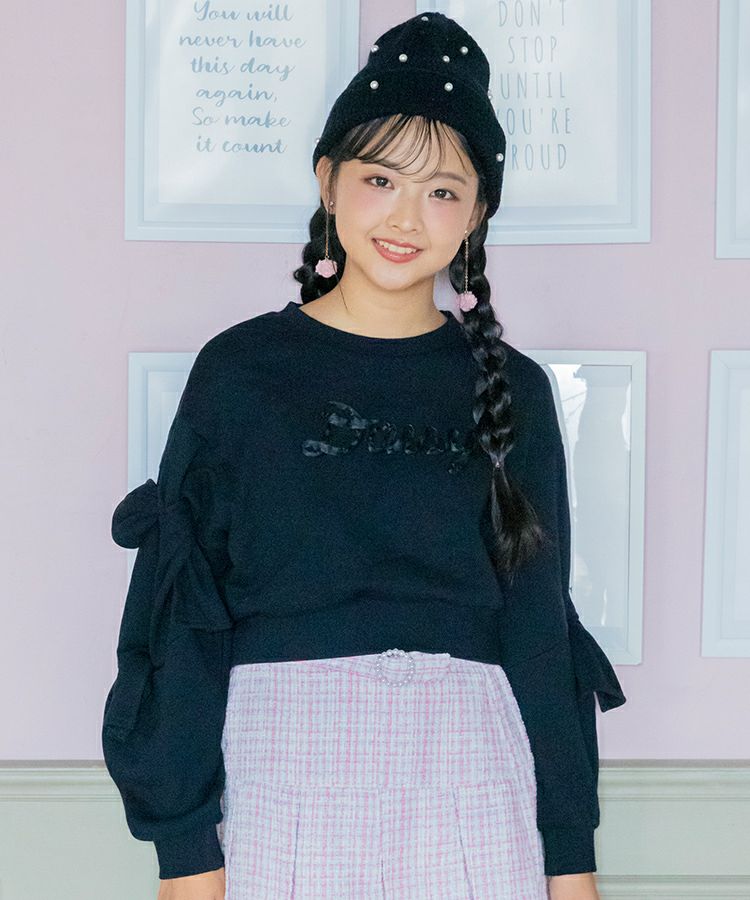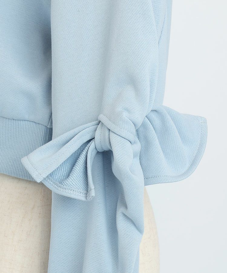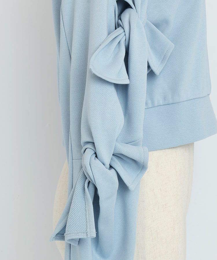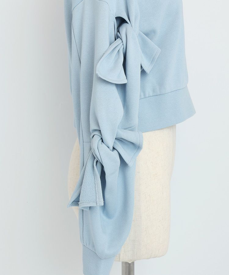 ■デザイン 袖にはアシンメトリーなリボンデザイン。軽く結ぶだけで簡単にリボンが完成します。お洗濯の際は外して干していただけるので乾きやすさも問題ありません。フロントにはリボンロゴ入り。他には無いこだわりのスウェットが着たい女の子におすすめです。ピリングができにくいコットン100%商品です。