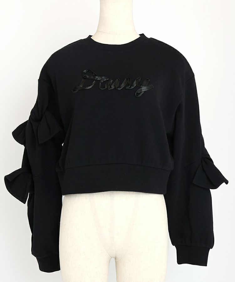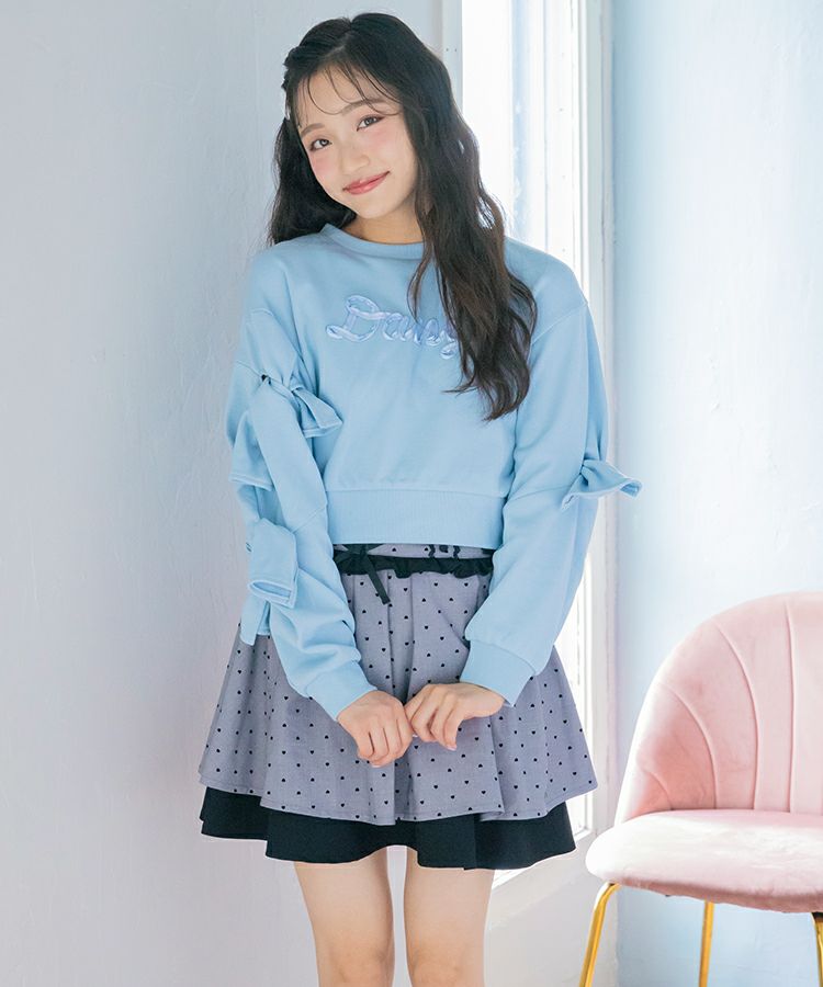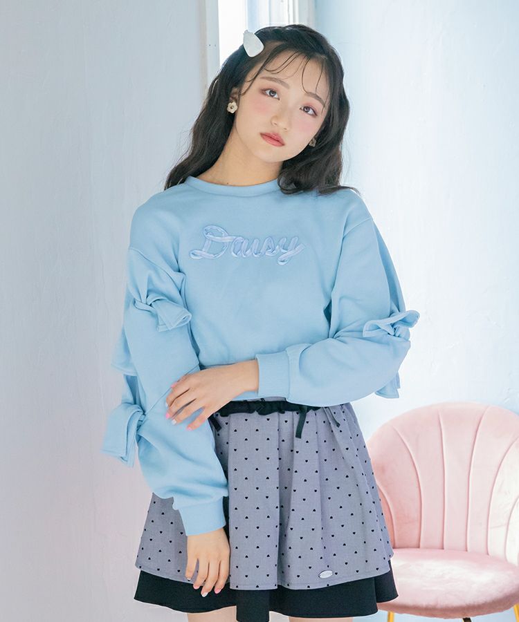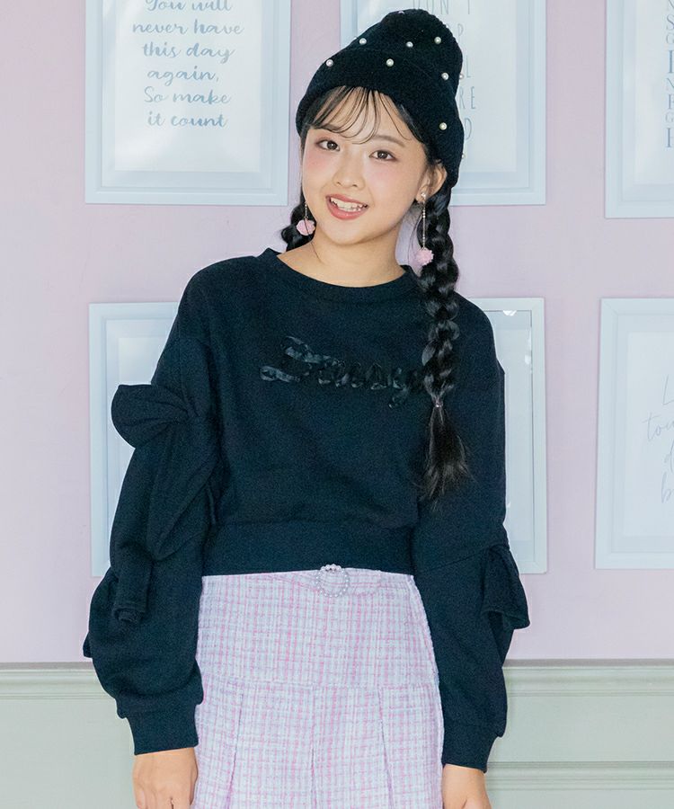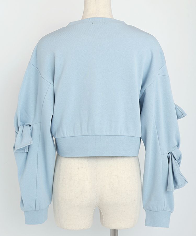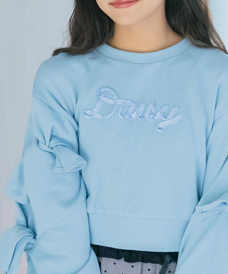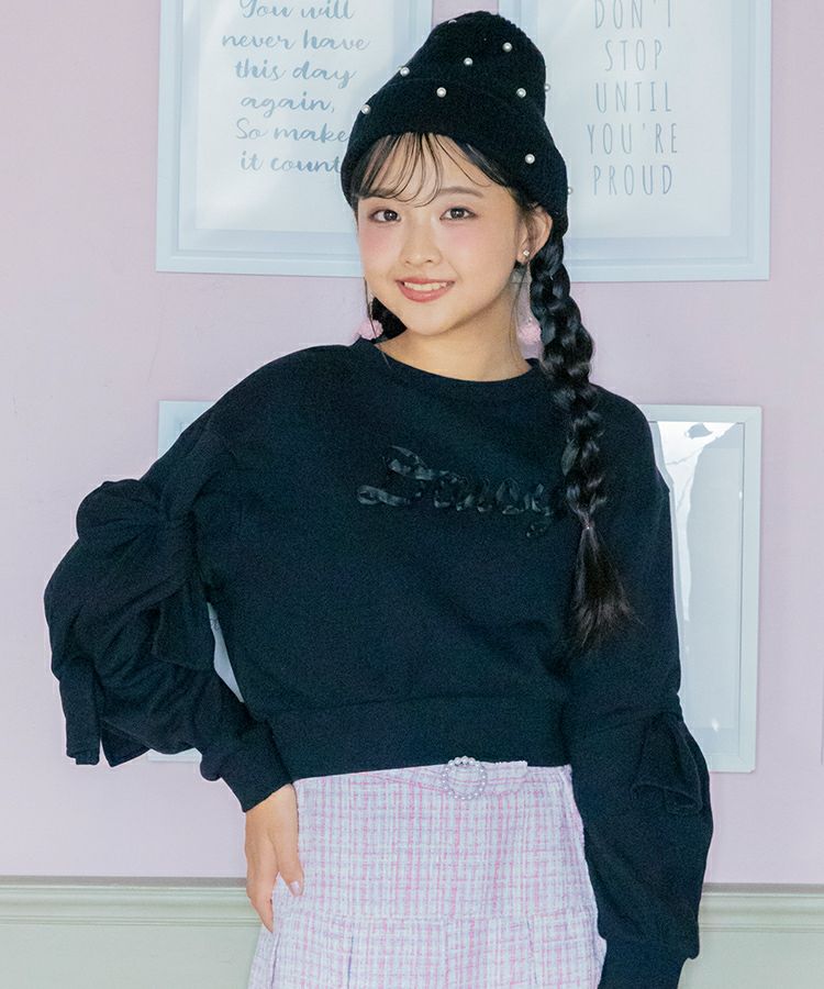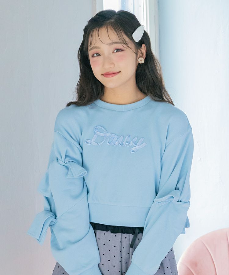 ■デザイン 袖にはアシンメトリーなリボンデザイン。軽く結ぶだけで簡単にリボンが完成します。お洗濯の際は外して干していただけるので乾きやすさも問題ありません。フロントにはリボンロゴ入り。他には無いこだわりのスウェットが着たい女の子におすすめです。ピリングができにくいコットン100%商品です。