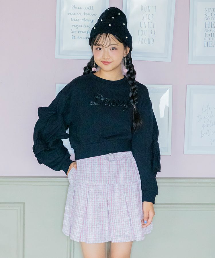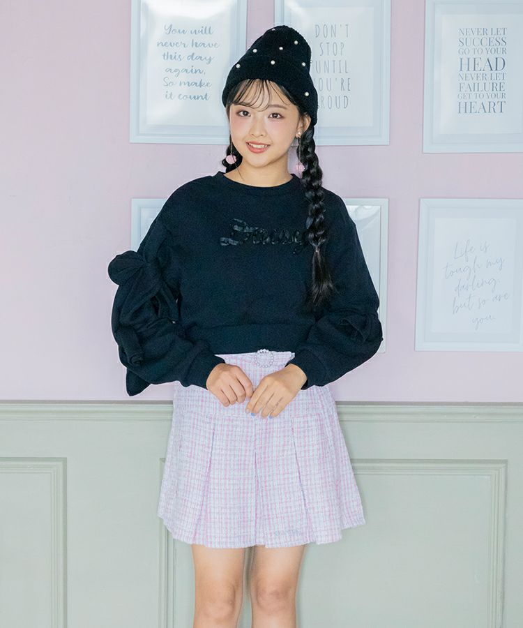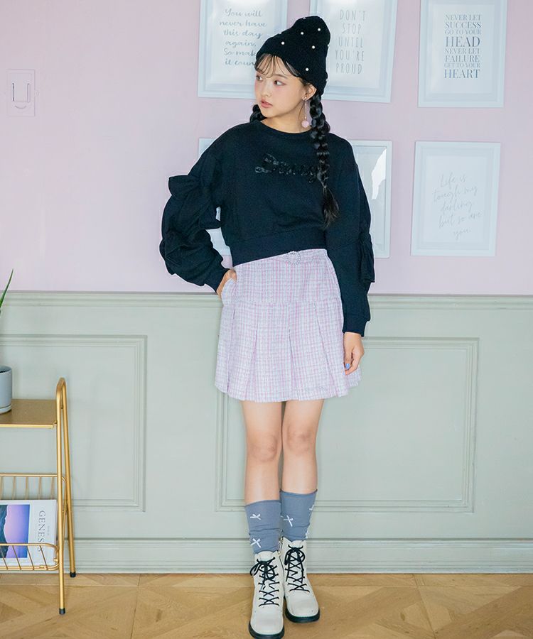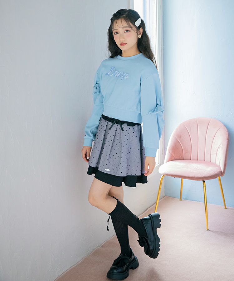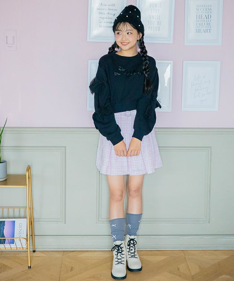 ■スタイリング スウェットはボトムにインをするとウエストのごろつきが気になるのでオーバーで着ていただくことを想定した丈感になっています。スカートに合わせてスクールガール風に、デニムと合わせてカジュアルガーリーにも。